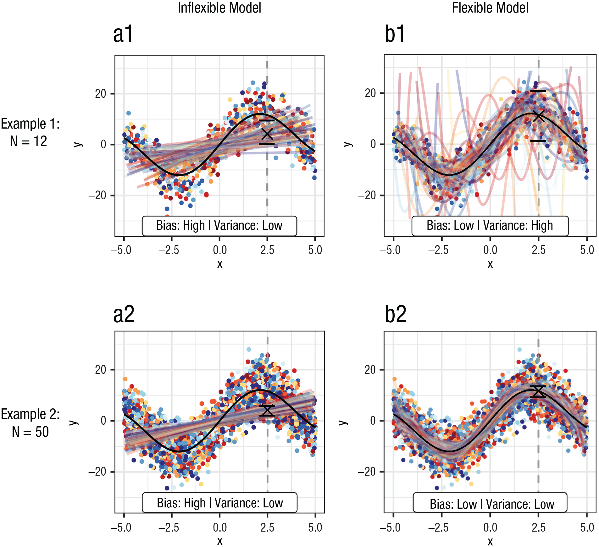 Figure 1 also illustrates that the bias-variance trade-off can be heavily influenced by sample size if we compare Examples 1 and 2. Both the inflexible and flexible models are trained on small samples (