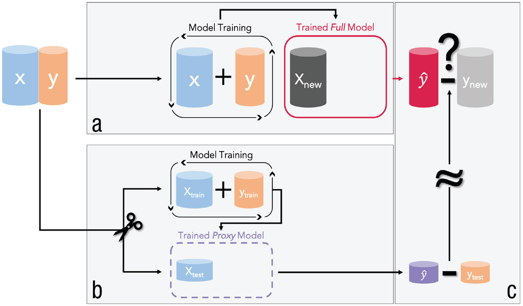 A visualization of how predictive performance is evaluated in supervised machine learning. (a) The training of the full model (red), which can later be used in an application (i.e., to predict new observations). The predictive performance of the full model is estimated by resampling. For this purpose, a proxy model (purple) is trained on (b) a training set, and the predictive performance computed on (c) the corresponding test set is used as an estimate of the predictive performance of the full model.
