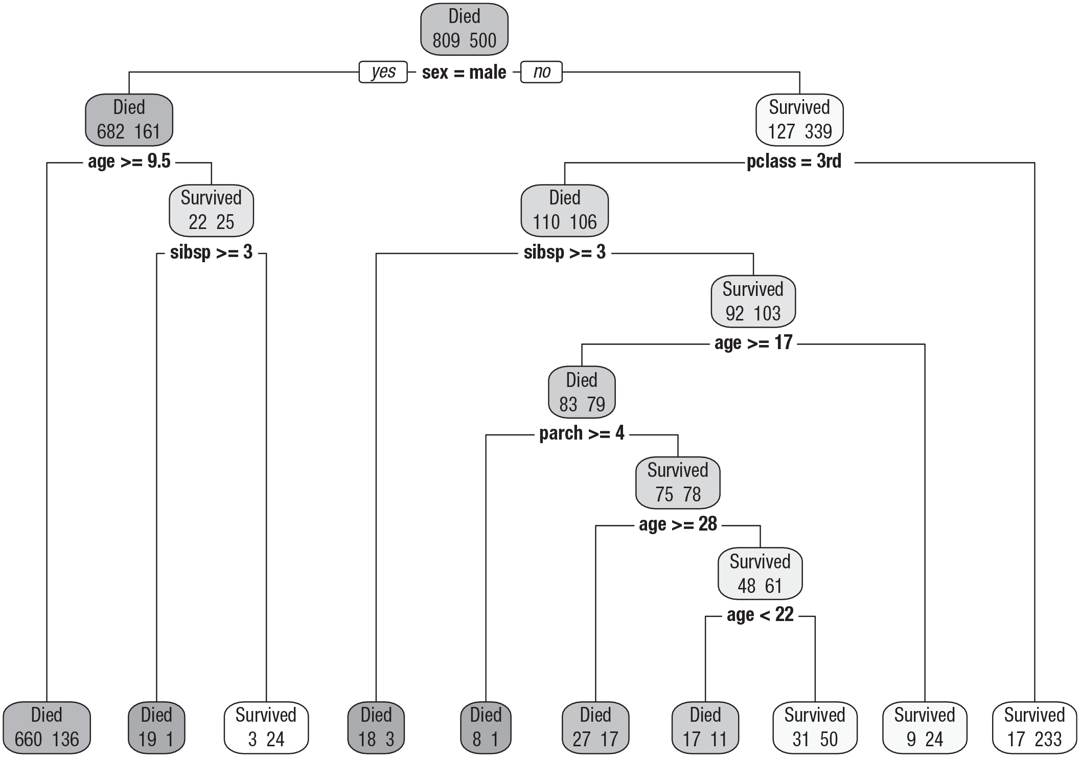 We start with a graphical demonstration based on the Titanic data set, which is simpler to interpret than examples based on the PhoneStudy data. The decision tree in Figure 5 predicts whether passengers of the