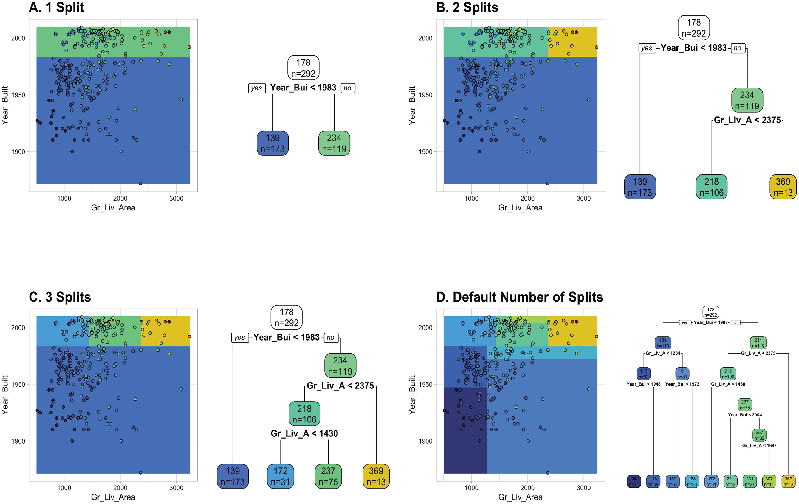 Figure 6 visualizes the tree-growing process for a regression example based on a reduced version of the AmesHousing regression task from two different perspectives. The sale price of a property is predicted with the two continuous features,