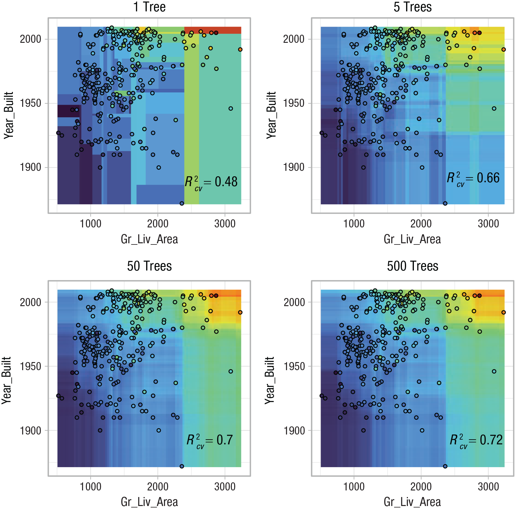 Figure 7 visualizes how the RF predictions change with an increasing number of trees using the reduced AmesHousing regression task with two continuous features. For