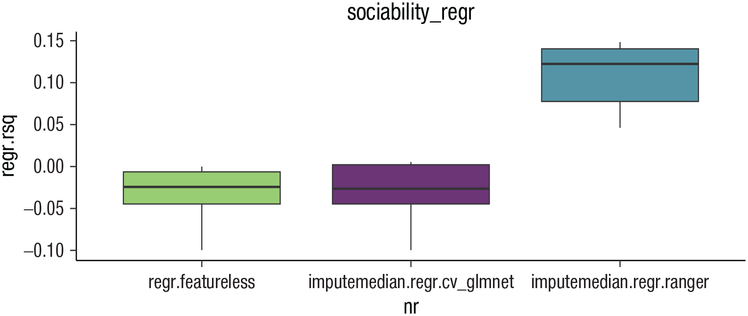 Box plots displaying the results of the benchmark experiment of the Sociability regression task using the PhoneStudy data set.