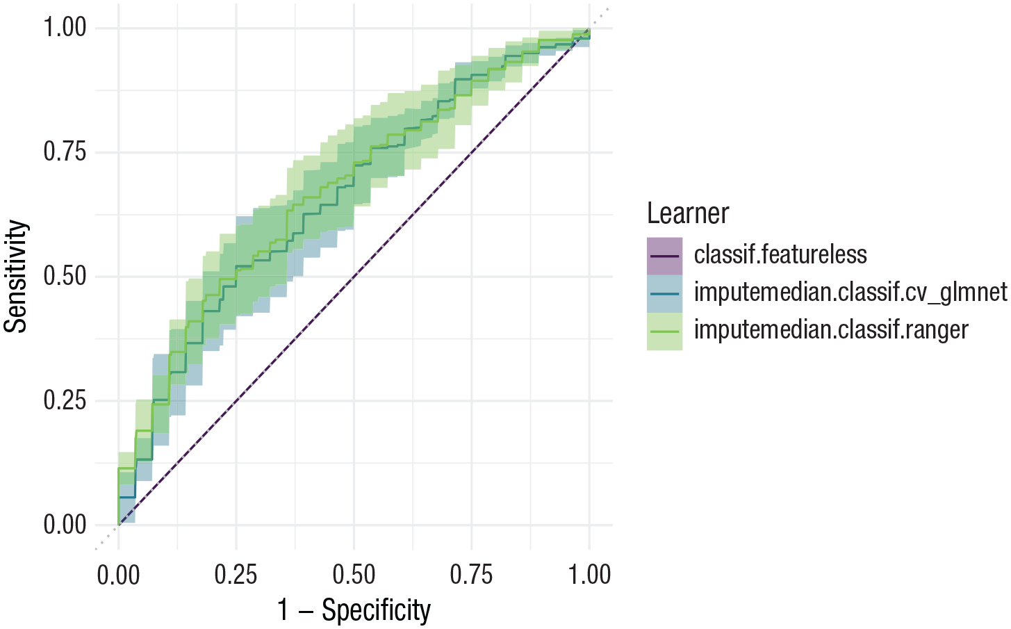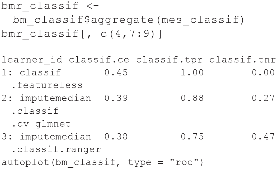 The commands to display benchmark results are similar for the classification benchmark. Instead of the grouped box plot, we here show how to produce a simple ROC plot (see Fig. 9) by calling