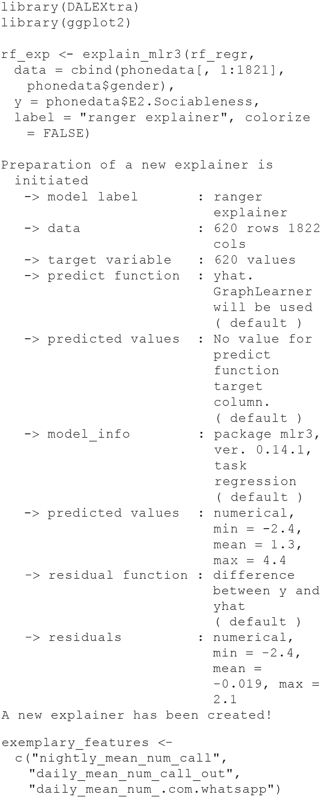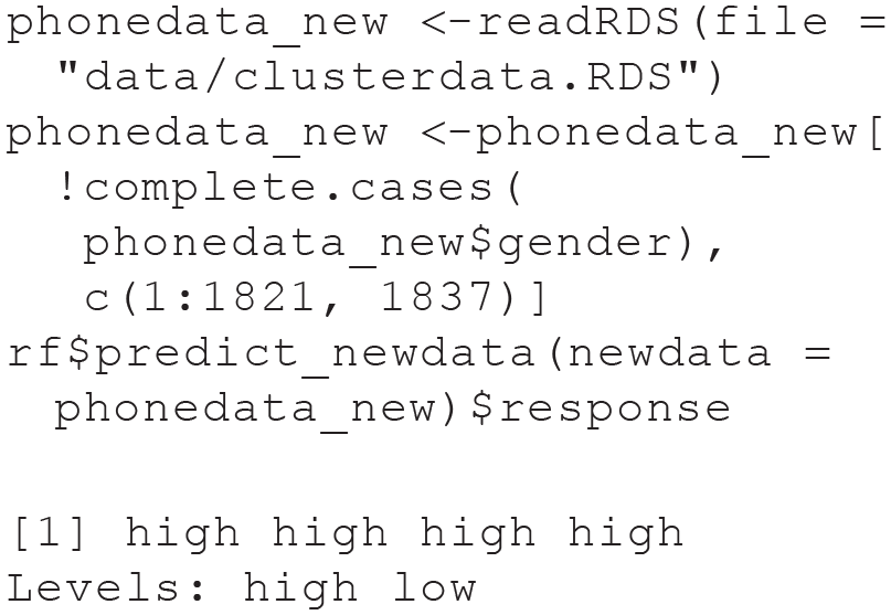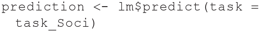 We just predicted the same data that we already used for model training, but we could also compute predictions for new observations. In the Sociability task, we did not include four individuals with missing values on the gender variable. Because we do not use gender as a feature here, we can treat these individuals as new data and predict their sociability score with