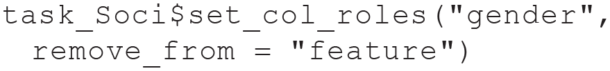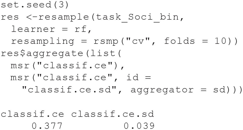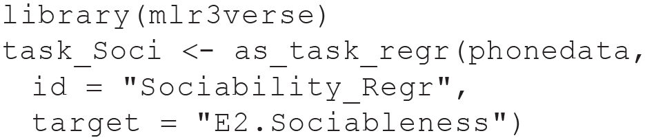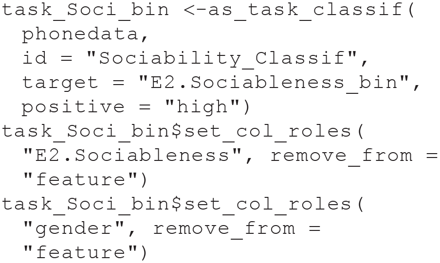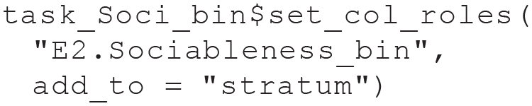 In the following line, we specify our target as a so-called stratification variable. When we later split the task for CV, this will (roughly) keep the proportion of high and low sociability in each training set equal to the proportion in the complete data set. Using stratified resampling for classification tasks is usually a good idea because it improves the precision of performance estimates, especially for data sets with imbalanced classes or relatively few observations (Kohavi, 1995):