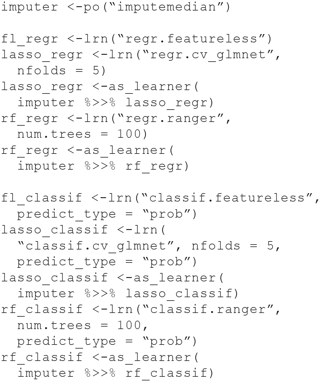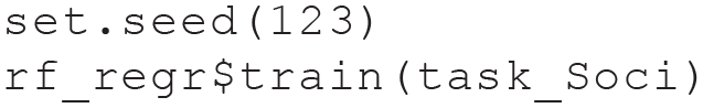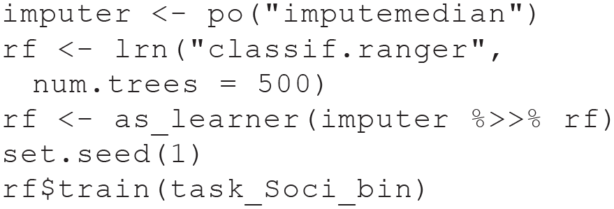 Next, we create a learner for the RF model, using the state-of-the-art implementation in the ranger package (Wright & Ziegler, 2017). We can directly specify hyperparameter settings of the learner (e.g., the number of trees). To handle the missing data, we again fuse our learner with our imputation strategy and create a GraphLearner. Because the RF algorithm contains random steps (drawing bootstrap samples), we set a seed before training the learner on our classification task to make the results reproducible.