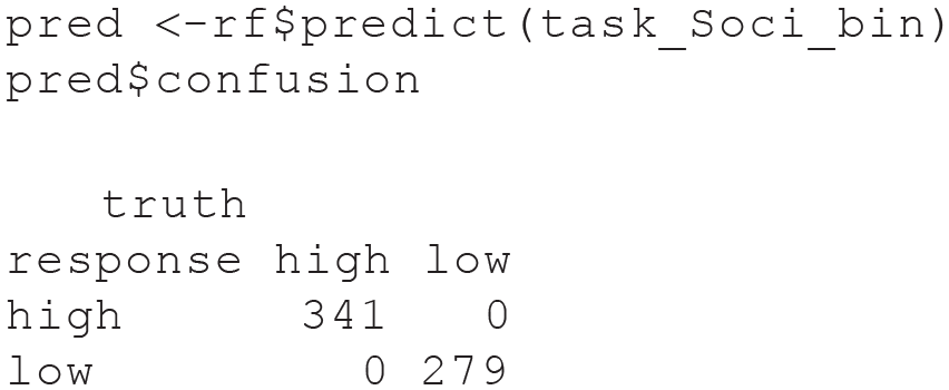 As before, we could also calculate in-sample predictive performance by computing predictions for the same data used in training. Now that we have a classification task, the prediction object also contains a confusion matrix of our in-sample predictions: