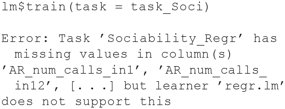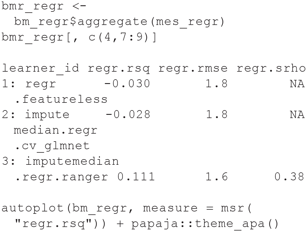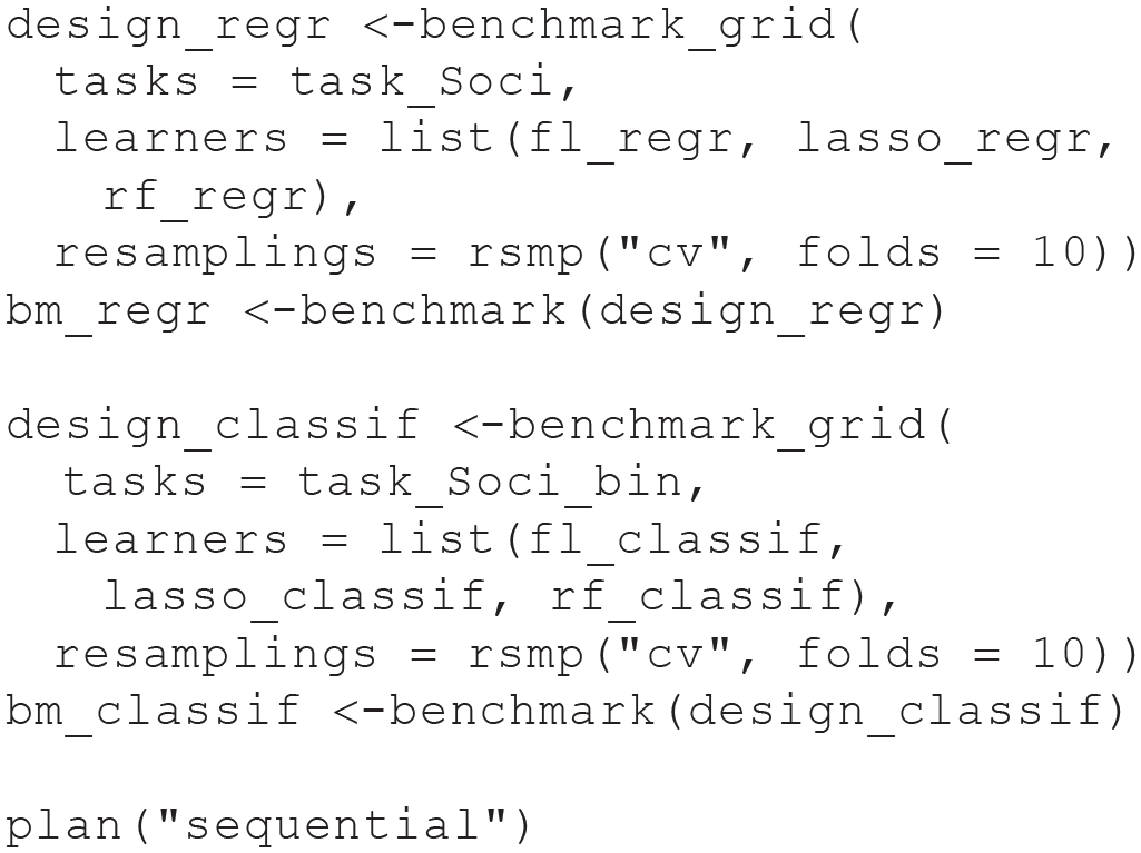 In our third exercise, we conduct two benchmark experiments. The first benchmark experiment illustrates a regression task, the second a classification task. We apply the RF from Module 2, along with other learners. Besides a featureless learner, we also compare the RF to a so-called least absolute shrinkage and selection operator (LASSO) model (Tibshirani, 1996) in our benchmark experiments. The LASSO is a linear regression (or classification) model that can effectively include a large number of features by shrinking the coefficients toward zero. This shrinkage also results in coefficients of exactly zero for unimportant features, thereby performing automatic variable selection because the corresponding features will not be taken into account when computing predictions. The results can be interpreted similar to ordinary linear or logistic regression because the LASSO can be seen as an alternative method to estimate the model parameters of these models. We have observed in our own ML applications that LASSO often performs comparably or even better than RF on survey data (e.g., Pargent & Albert-Von Der Gönna, 2018). Thus, we recommend by default to include the LASSO into benchmark experiments when working with psychological data. A nontechnical introduction to the LASSO was provided by James et al. (2021).