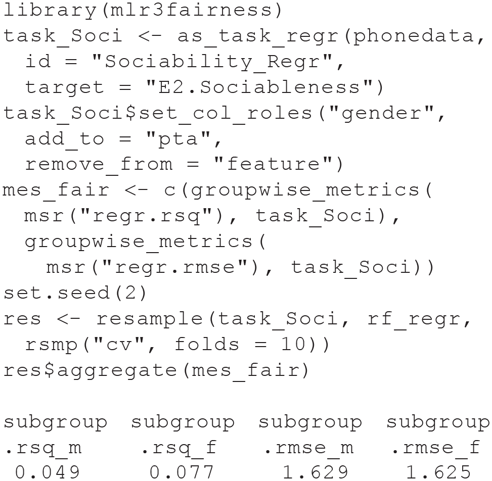 Closely related to IML is the topic of model fairness (Barocas et al., 2019). Intuitively, a trained ML model is considered fair if it does not discriminate against protected subgroups of observations (e.g., gender groups; Buolamwini & Gebru, 2018). However, which specific model behavior is considered fair is highly context-specific because it entails some normative consensus. It has been argued that all ML models applied in practice should be accompanied by transparent documentation on their performance characteristics and their intended use cases (Mitchell et al., 2019). Fairness seems particularly relevant when ML is used in psychological assessment (Stachl, Pargent, et al., 2020). In such settings, the “protected attribute” (e.g., the gender variable in the data set) is usually not included as a feature in the model to prevent the model from using the information in the protected variable to predict the target. However, flexible ML models often implicitly infer group membership on the basis of available features that are related to the protected attribute. Thus, it is necessary to explicitly evaluate fairness by comparing predictions for observations with different values on the protected attribute. Many techniques introduced in our performance evaluation and IML sections can be useful to creatively explore whether a trained model behaves as required by a fairness definition appropriate for the concrete use-case of the model. We give brief examples of two different fairness aspects in our applied section and refer readers to Barocas et al. (2019) for an extensive overview of fairness definitions and evaluation strategies. First, is the predictive performance of the model comparable for different values of the protected attribute? This can be evaluated by estimating out-of-sample performance separately for each value of the protected attribute. Second, do model predictions differentially depend on the value of some feature of interest for different values of the protected attribute? This can be evaluated by computing PVI rankings or ICE/PD plots separately for each value of the protected attribute.