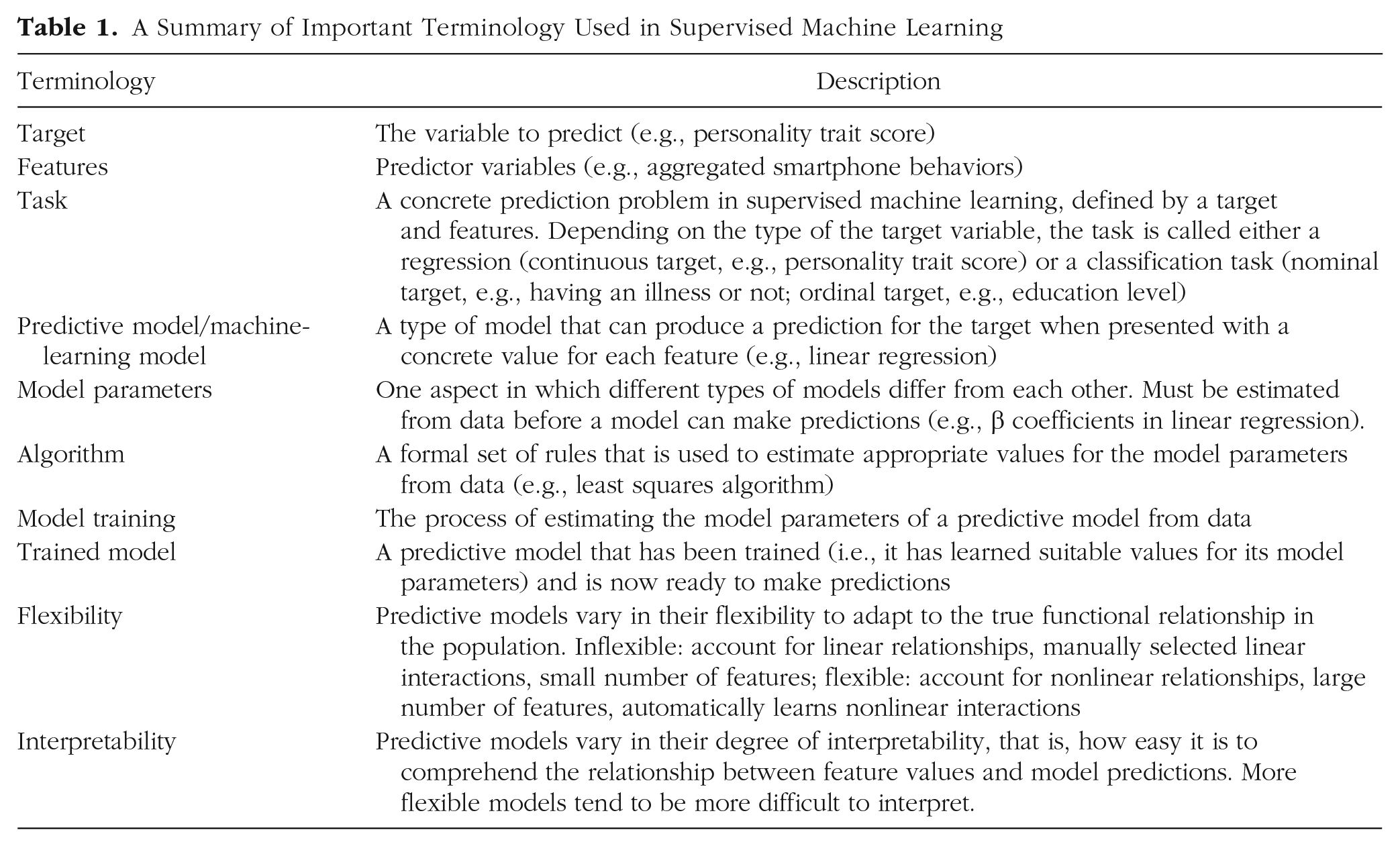 In the first section, we set the stage for the main modules of our tutorial by introducing the basic terminology of supervised ML and helping readers to adopt a predictive mindset that focuses on predicting new, unseen observations. Because ML uses a different language unfamiliar to psychologists, we summarized the most important terms in Table 1 to assist readers while working through the rest of the tutorial. Before we start with Module 1, we shortly introduce the data set and the software packages, which are used in the Practical Exercises 1 to 4.