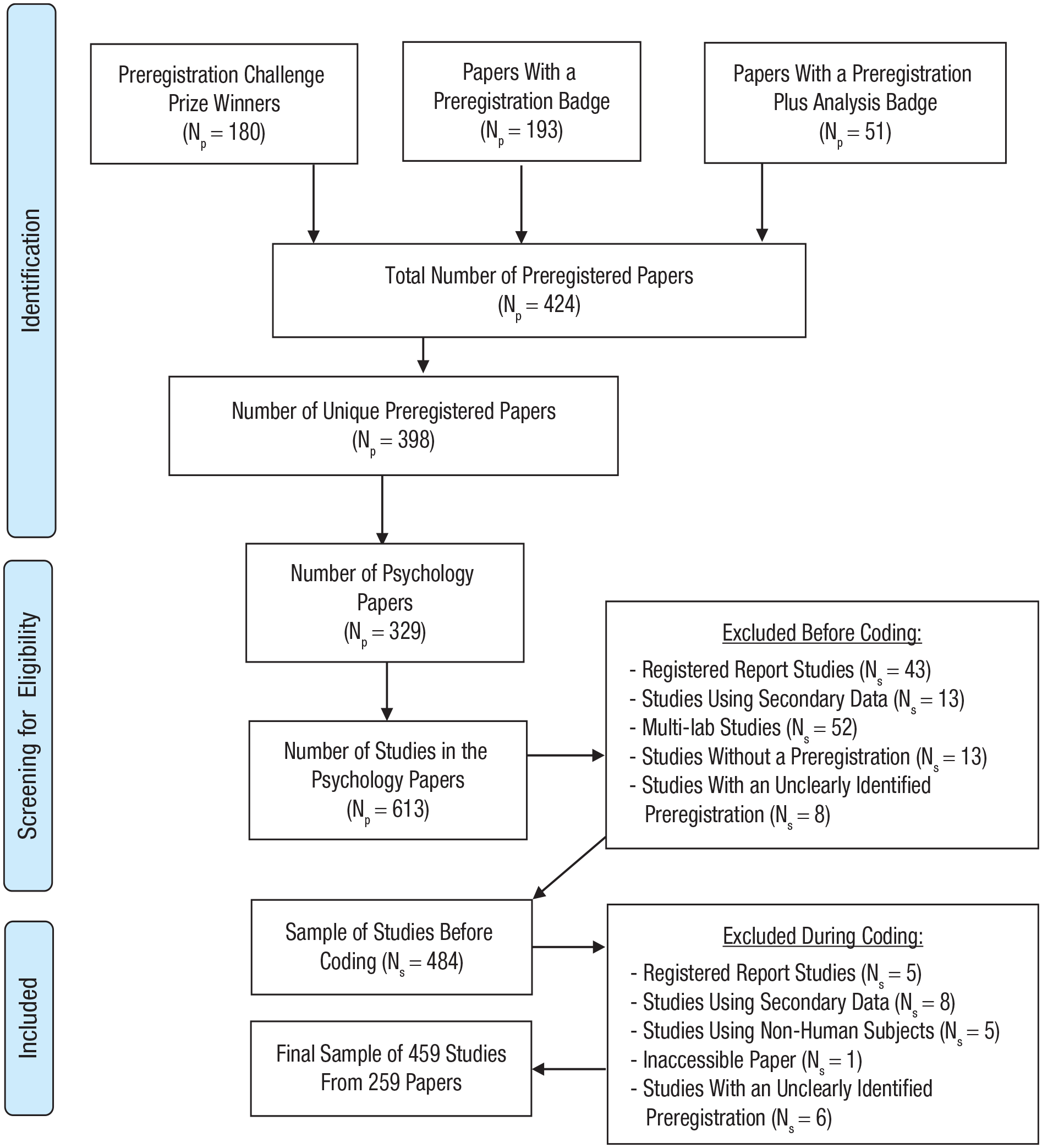 To assess whether these articles were from the field of psychology, we looked up their Research Areas as listed in the Web of Science Core Collection. If the article was not listed in that database, we categorized the Research Area ourselves on the basis of the publishing journal or the departmental affiliation of the authors. The articles in our sample often contained multiple preregistered studies. We considered a study separate from other studies in an article when that study was based on a different sample of participants. Each of these studies was coded separately. For the 329 psychology articles we included, we derived 613 preregistered studies.
