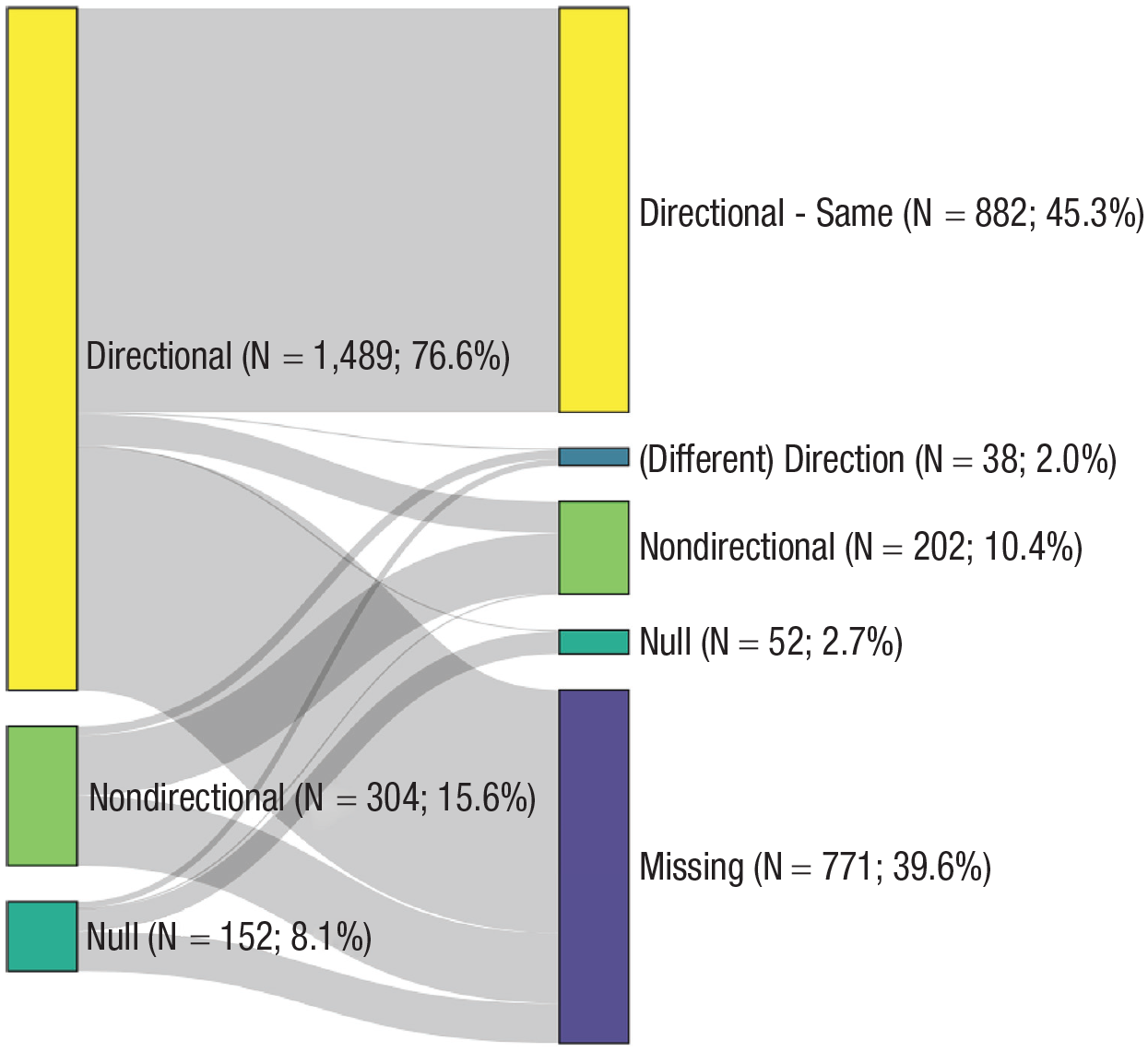 Sankey diagram indicating how the directionality of hypotheses changed from (left) preregistration to (right) article.