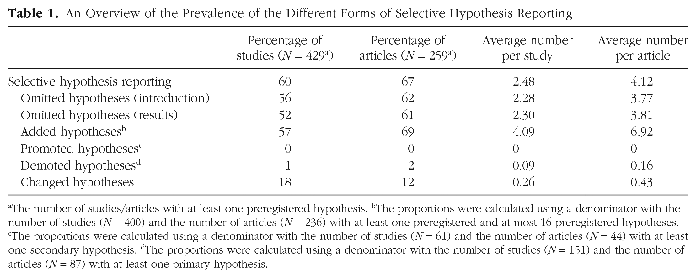 Because of time constraints, we assessed only selective hypothesis reporting for the first 16 preregistered hypotheses of a study even if more than 16 preregistered hypotheses were identified. In those instances, we also did not check for added hypotheses. Finally, note that the categories omitted, added, promoted, and demoted hypotheses are mutually exclusive but not exhaustive categories. In the present article, we state that a study does not include selective hypothesis reporting when it does not include any omitted, added, promoted, demoted, or changed hypotheses.