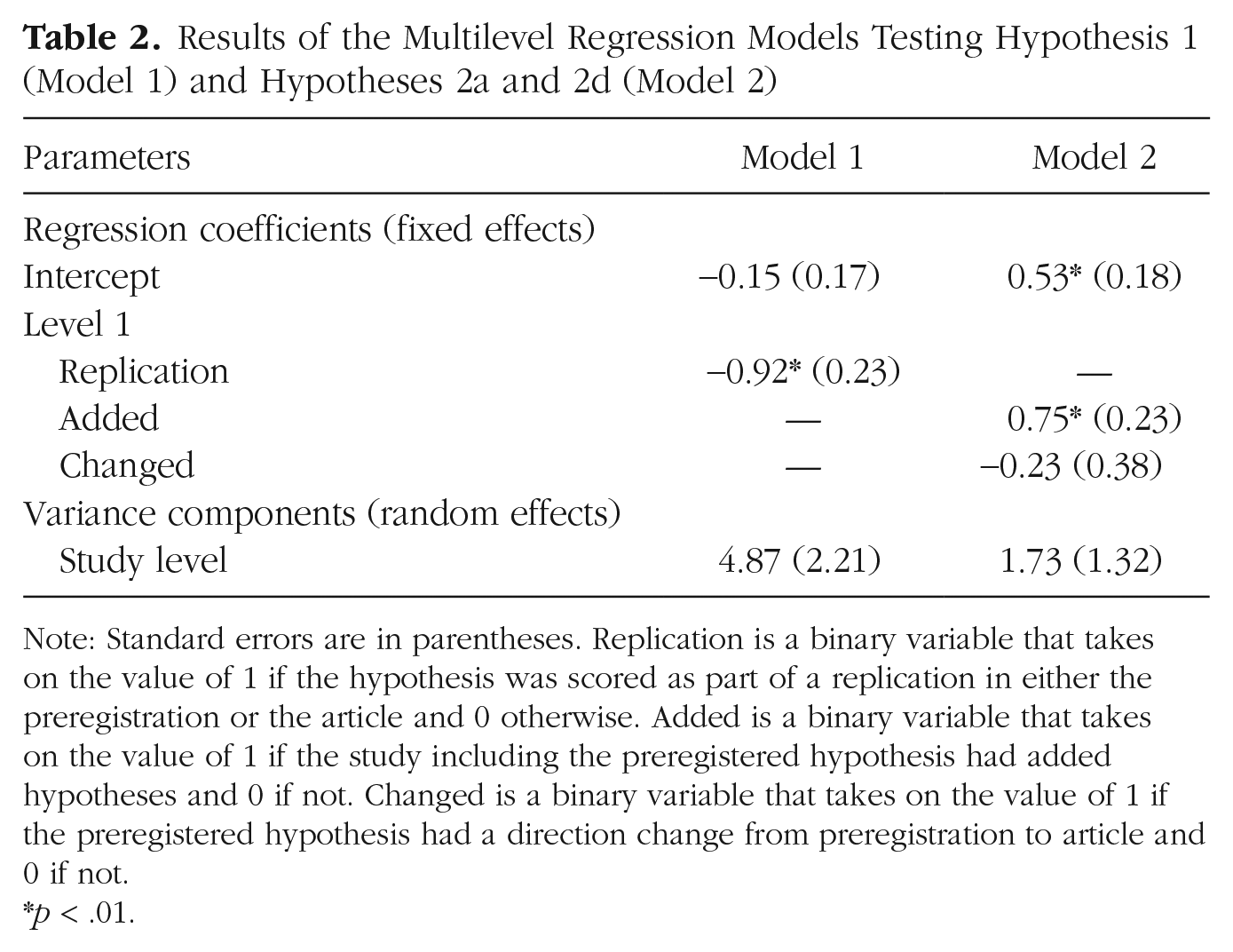 As tests of our Hypotheses 2a through 2d, we preregistered a multilevel logistic regression with hypothesis as Level 1, study as Level 2, and article as Level 3. The regression would include a binary dependent variable indicating whether the result is statistically significant and four Level 1 binary variables, each indicating whether a hypothesis is selectively reported in a certain way: added hypotheses (Hypothesis 2a), promoted hypotheses (Hypothesis 2b), demoted hypotheses (Hypothesis 2c), and changed hypotheses (Hypothesis 2d). We had to omit promoted hypotheses from our model because we did not encounter these. The remaining model did not converge when we included Level 3 or when we included demoted hypotheses. Therefore, we adjusted our model to a two-level model that could test only Hypothesis 2a and 2d. We had preregistered the conditional move to a two-level model, but dropping the promoted and demoted hypotheses was unforeseen and thus not preregistered. We tested Hypotheses 2a and 2d against α = .01, as was preregistered. We found that preregistered hypotheses in studies with added hypotheses were more likely to be statistically significant than preregistered hypotheses in studies without added hypotheses, β1 = 0.75,