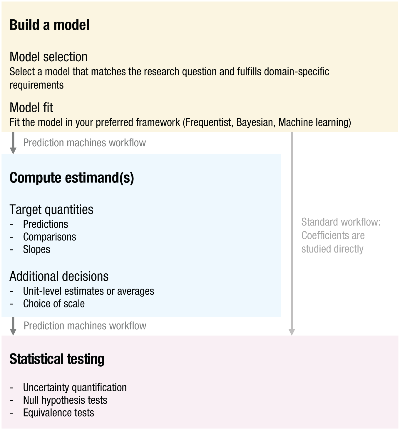 Overview of the workflow in which models are treated as prediction machines. Researchers build a model, use the model to compute meaningful target quantities, and subsequently conduct tests on these quantities. In contrast, in the standard workflow, researchers directly interpret and test the model coefficients.