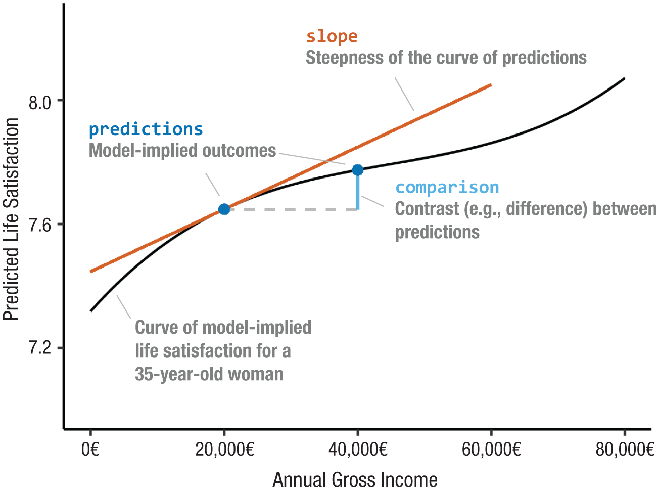 Comparisons between predictions are useful when the analysts’ goal is to study associations or to make causal claims. They can always be thought of as a measure of conditional association, holding control variables constant. In some cases, when additional identification assumptions are met, they can also be interpreted causally, as the contrast between two potential states of the world. Determining whether a causal interpretation is warranted requires careful consideration of identification assumptions (for an introduction in psychology, see Rohrer, 2018). In our running example, omitted confounders, such as health, education, or personality, likely prevent a causal interpretation of the relationship between income and life satisfaction.