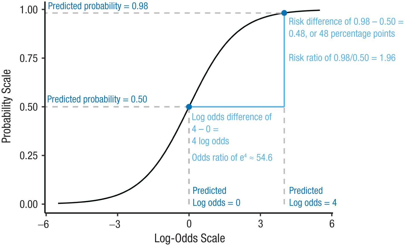 Mapping between the log-odds scale (the link scale underlying binary logistic regression) and the probability scale (probability of outcome = 1, response scale). The two blue dots mark two predictions that a binary logistic model may return. The comparison between these two predictions can be expressed in different ways, depending on which scale one chooses (log-odds vs. probability) and how the predictions are contrasted (difference vs. ratio).