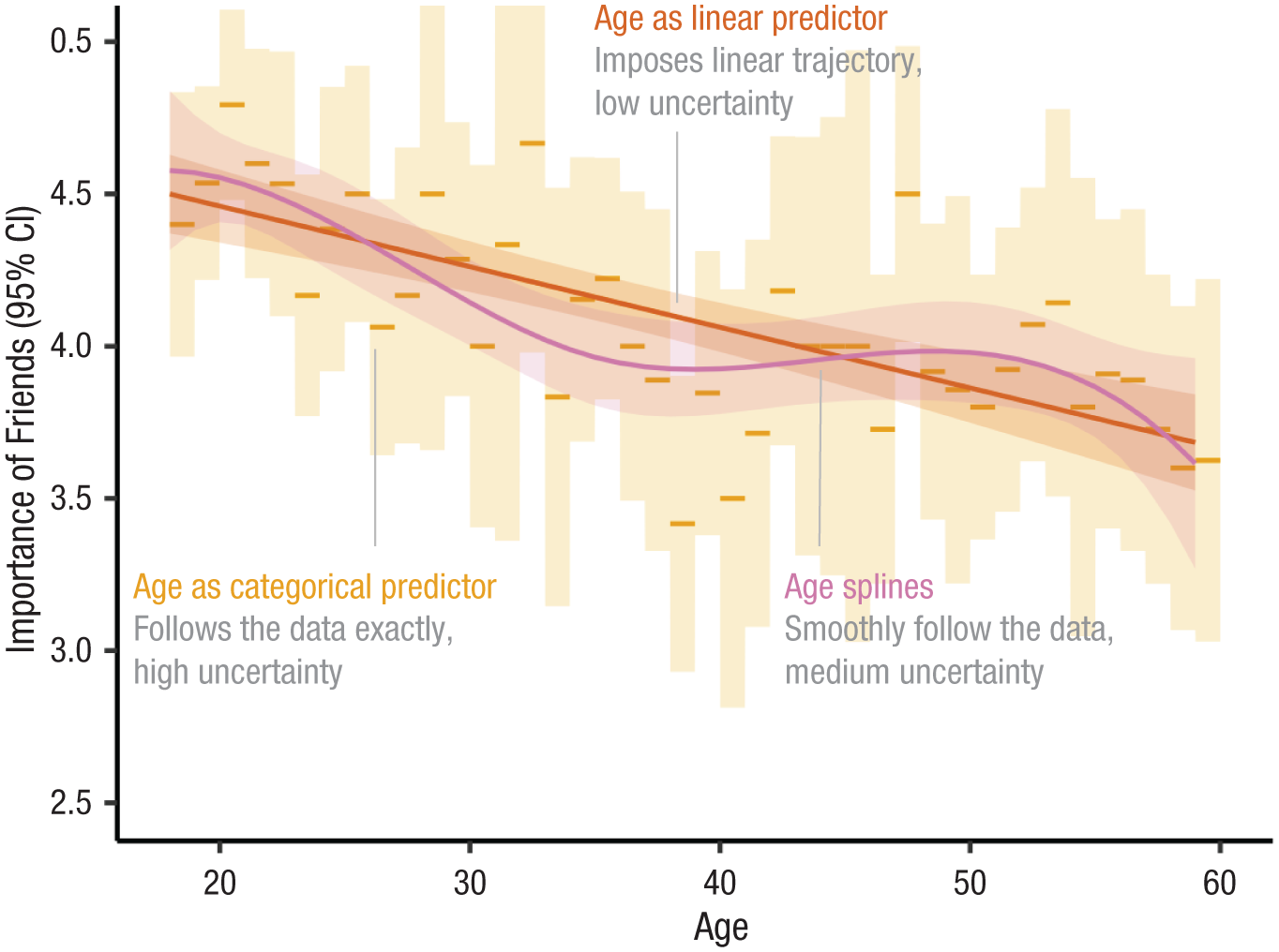 ; for arguments in favor of polynomials, see Kroc & Olvera Astivia, 2025). A third alternative is to use splines. These result in flexible, locally smooth trajectories. Unlike polynomials, splines enforce no global functional forms; unlike age categories, splines do not result in abrupt jumps in the trajectory. Both features may be desirable in many contexts, but splines are rarely used in psychological research—likely because they produce confusing regression outputs because they are implemented with the help of multiple synthetic variables that will each show up in the regression output with their own coefficients. Our goal in this section is to illustrate the merits of a workflow that does not require one to interpret individual coefficients, which circumvents the interpretation challenges posed by flexible modeling strategies, such as splines. In our regression model, we thus include age with the help of basis splines with 4