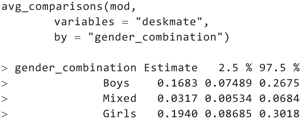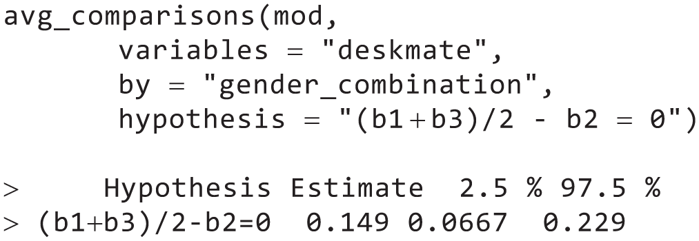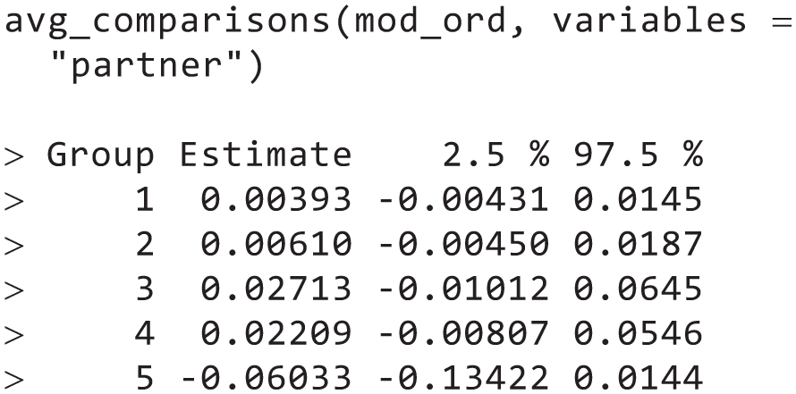 To illustrate this, our example includes all two-way interactions between the predictors. On the article’s accompanying website (https://j-rohrer.github.io/marginal-psych/), we push this even further and also include the three-way interaction to illustrate that this does not complicate model interpretation; the same function call is used to generate the target quantity. Furthermore, in this example, the inclusion of the interactions does not affect the precision with which the target quantity is estimated. This highlights how imprecision in the model coefficients does not automatically translate into imprecision in target quantities.
