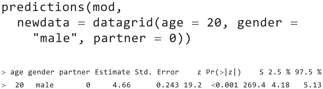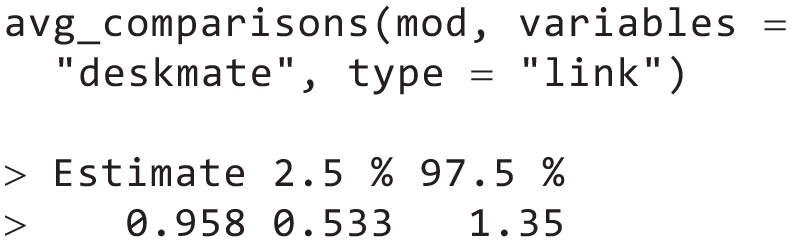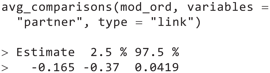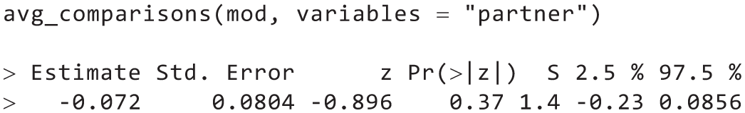 Above, we reported quantities expressed on the actual outcome scale—points on a life-satisfaction scale. Depending on the type of model used, other outcome scales may also be sensible. For example, in a binary logistic regression, the model expresses the log-odds of a binary outcome as a linear function of the predictors. One could therefore compute quantities of interest on this log-odds scale, which happens to be the scale on which coefficients are usually displayed by default. Alternatively, it is possible to transform the log-odds into odds ratios, another common way to summarize effects. Finally, because odds are unfamiliar to most audiences—except perhaps statisticians and gamblers—it may be more intuitive to present results on the “original” response scale (also called the natural scale), which for the case of a binary outcome, corresponds to probabilities.