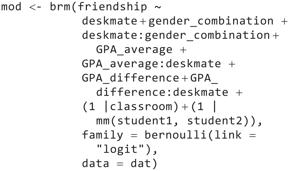 The unit of observation in this analysis is pairs of students that are nested within classrooms. For each pair, we know (a) whether they are