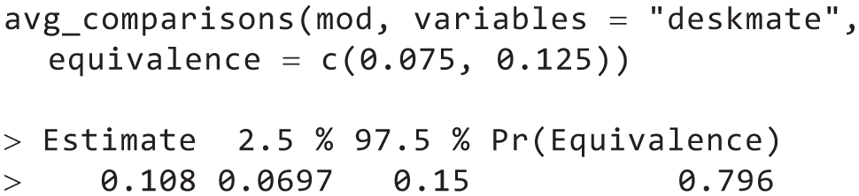 An equivalence test flips the logic of a null hypothesis test: Instead of asking whether one can reject a null of no effect, it asks whether one can reject the possibility that the size of effect is substantively meaningful (Lakens et al., 2018). Again, such tests can be applied to a variety of quantities.