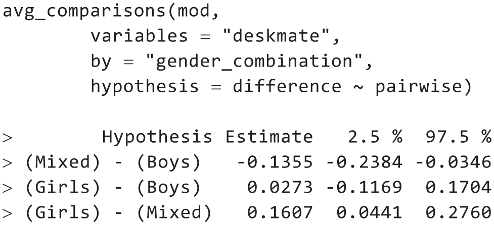 A big advantage of this approach is that it is model-agnostic. Interpretation works the same regardless of whether the model is linear, generalized linear, or generalized additive; whether it includes a multilevel structure; whether it contains interactions and/or splines; or whether it is estimated using a Bayesian or frequentist approach. The workflow can also be applied to machine-learning models, in which case, it aligns closely with ideas from the interpretable machine-learning tradition that aims to summarize model behavior in a model-agnostic manner (Molnar, 2020). Across models, the software commands that analysts need to execute stay the same, which greatly facilitates the exploration of model specifications to check the robustness of findings. Other smaller perks include that one does not need to perform preestimation transformations, such as centering or contrast coding. For categorical predictors, for example, one can simply include them “as is” and then use postestimation commands to calculate any contrast of interest.