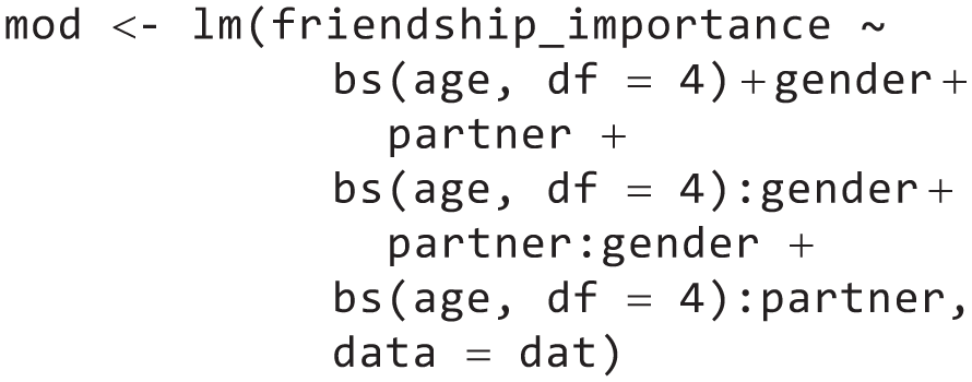 Before fitting the model, consider two strategies that we can deploy to control for variables, such as age and gender, in a flexible manner: splines and interactions. We motivate both approaches briefly, but our main goal is not to defend or advocate for a particular model specification. Rather, this worked example is designed to show that even when researchers fit complex models, the interpretation of results can remain easy.