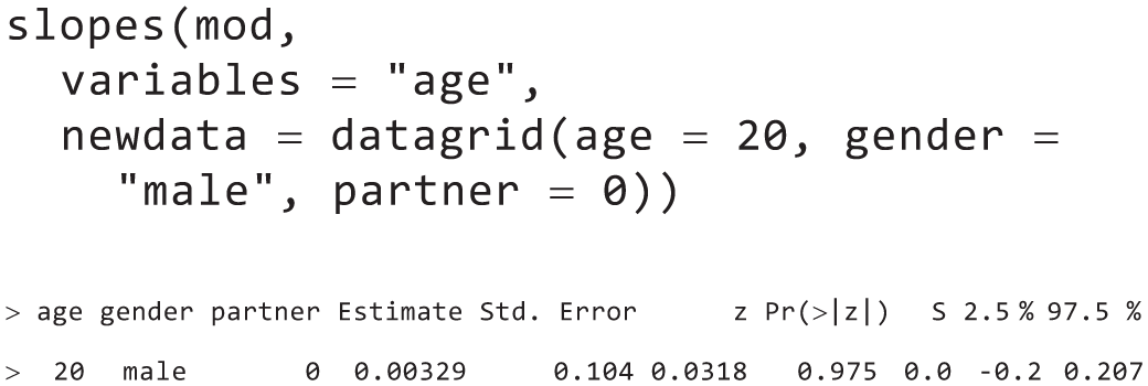 Another popular set of target quantities in the social and behavioral sciences were labeled by Williams (2012) as marginal effect at the mean (MEM), marginal effects at representative values (MERs), and average marginal effect (AME). In our terminology, these would correspond to (a) the slope for a hypothetical individual whose characteristics are average (MEM), (b) the slope for hypothetical individuals whose characteristics are representative (MERs), and (c) the average of all slopes computed for each individual in the observed data set (AME). 8