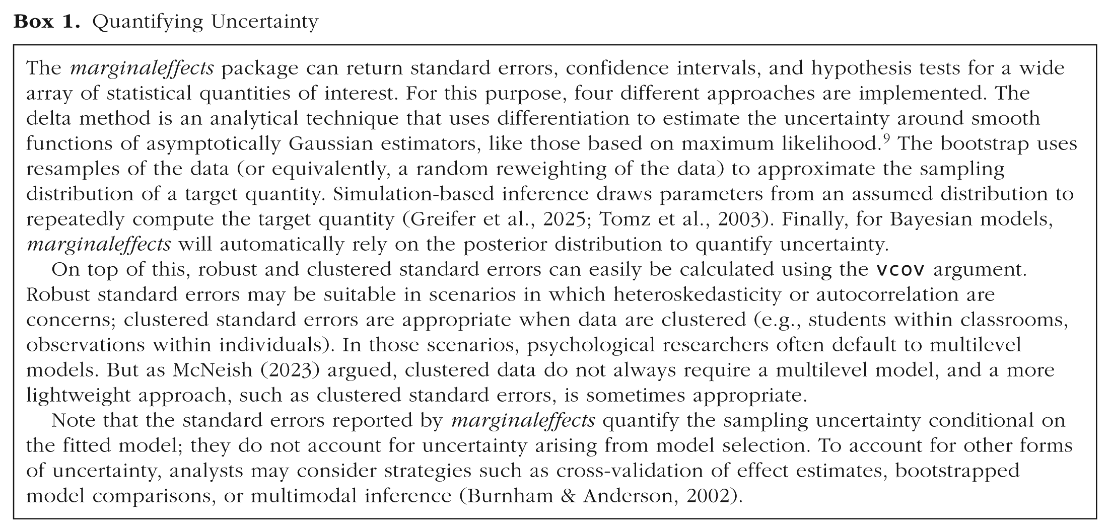 Researchers focusing on coefficients are often interested in the uncertainty associated with those coefficients and in whether they are statistically significantly different from zero. However, when focusing on target quantities instead, the significance of individual coefficients is of little interest. Rather, researchers may want to measure the uncertainty associated with their target quantities (see Box 1), and they may also wish to subject these quantities to various statistical-testing procedures, such as testing whether they should reject a null hypothesis (typically: no difference/association/effect) given a certain model and set of assumptions. In that manner, the statistical test conducted directly refers to the metric the analyst has determined to be substantively meaningful.