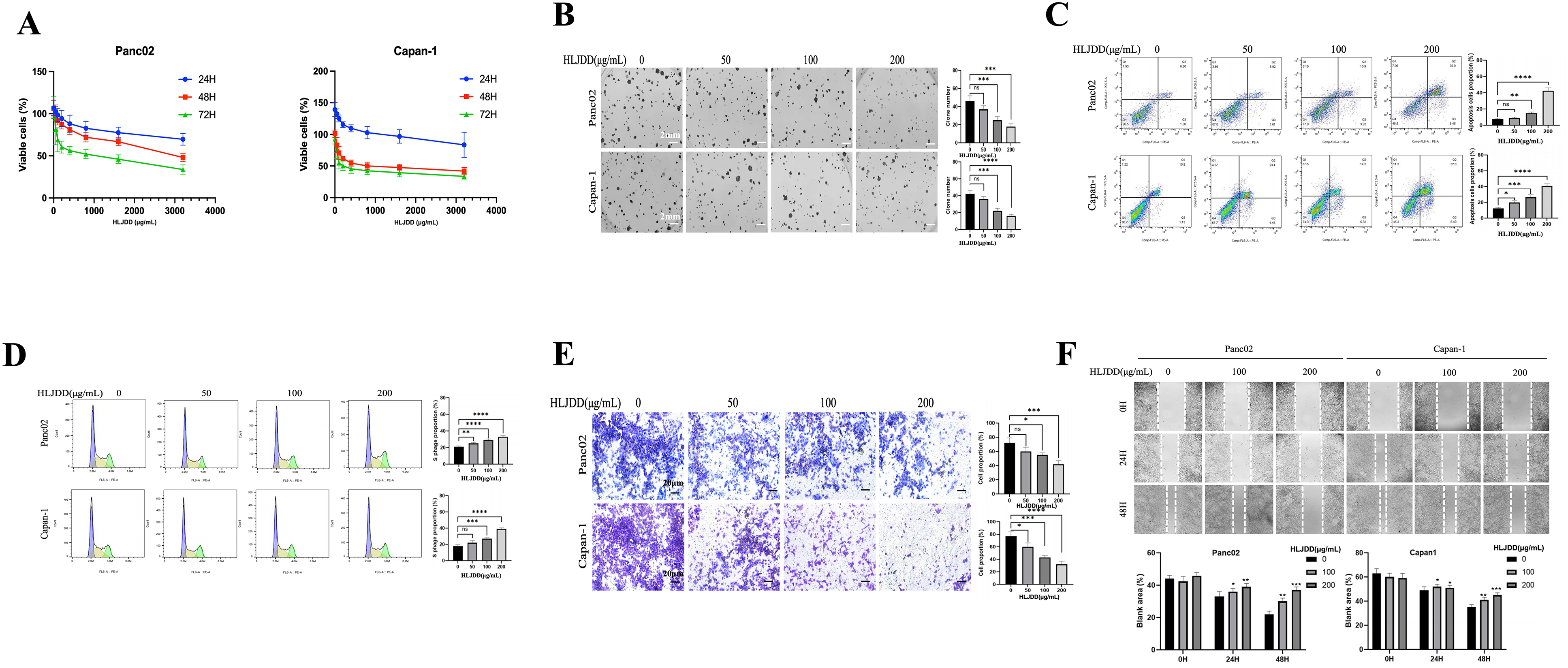 To evaluate the induction of apoptosis, Annexin V/PI staining was conducted on HLJDD-treated PAAD cells. The results indicated that HLJDD treatment induced significant early and late apoptosis in a dose-dependent manner in Capan-1 and Panc02 cells (Figure 1C). Additionally, PI staining of cellular DNA for the cell cycle analysis revealed that HLJDD induced an S- phase arrest in these cell lines (Figure 1D), indicating an interruption of cell cycle progression.