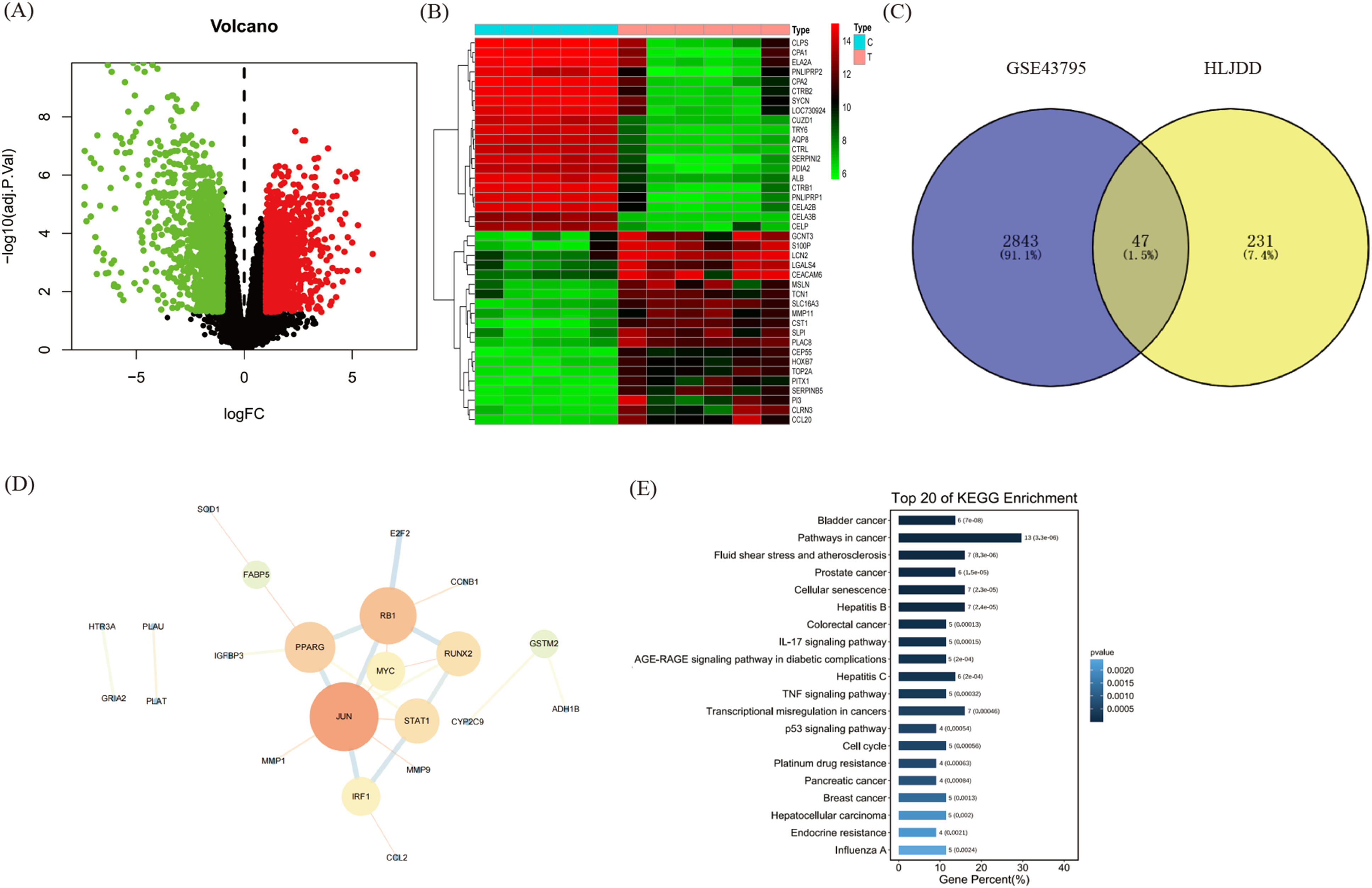 Targets identification of HLJDD in the treatment of pancreatic cancer. (A) The volcano plot of PAAD DEGs. (B) The heat map of PAAD DEGs. (C) The Venn diagram of core genes in HLJDD target genes and PAAD DEGs. (D) The PPI network diagram of the interaction between the 47 overlapping genes. (E) KEGG pathway analyses of the 47 overlapping genes.