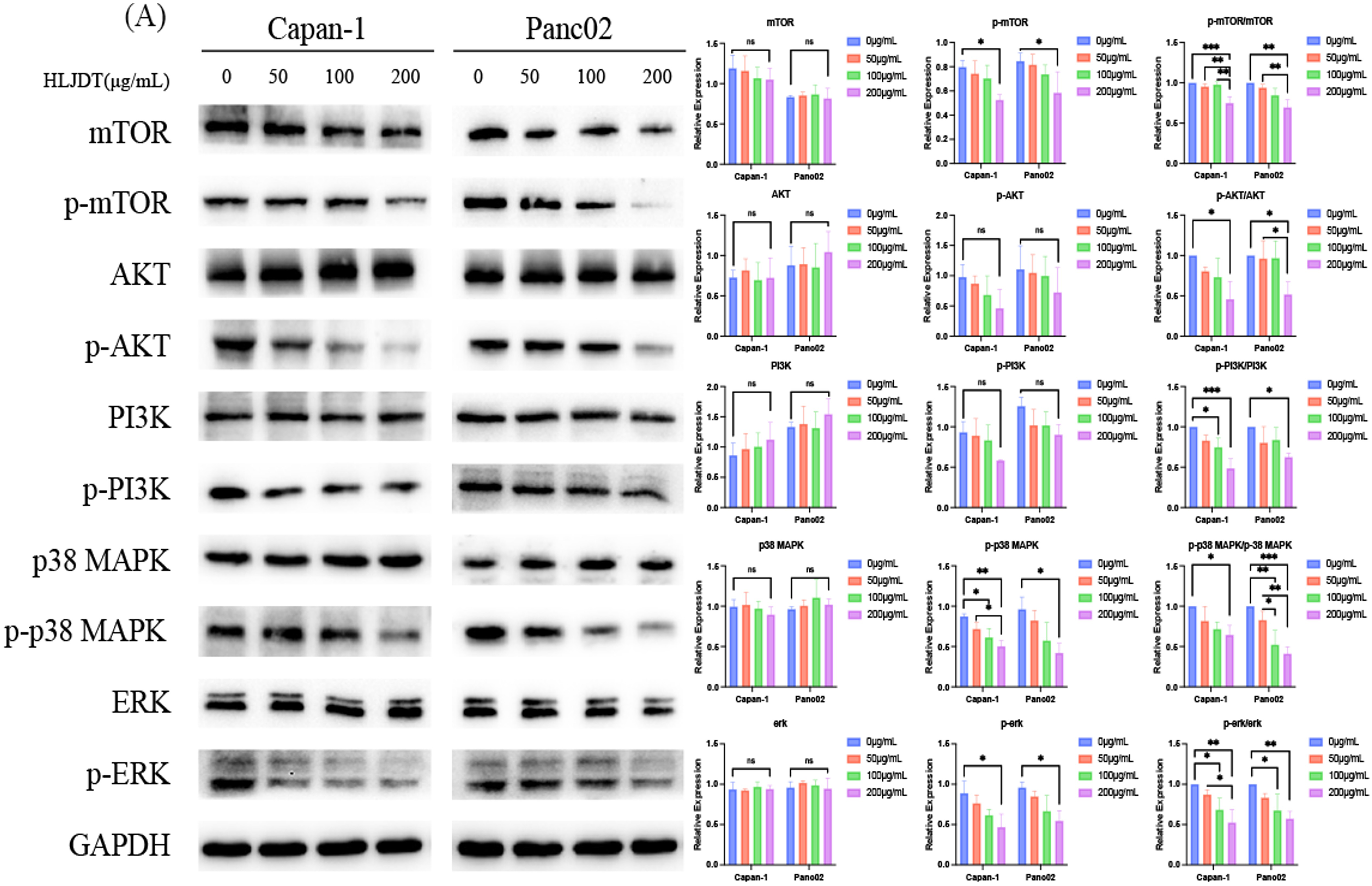 PI3K/AKT/mTOR and MAPK/ERK1/2 signaling pathways may be involved in the therapeutic effect of HLJDD on PAAD. Western blot analysis of protein levels of p-mTOR, mTOR, p-AKT, AKT, p-PI3K, PI3K, p38 MAPK, p-p38 MAPK, ERK1/2, p-ERK1/2 and GAPDH in Capan-1 and Panc02 cells. All data were expressed as mean ± SD (ns