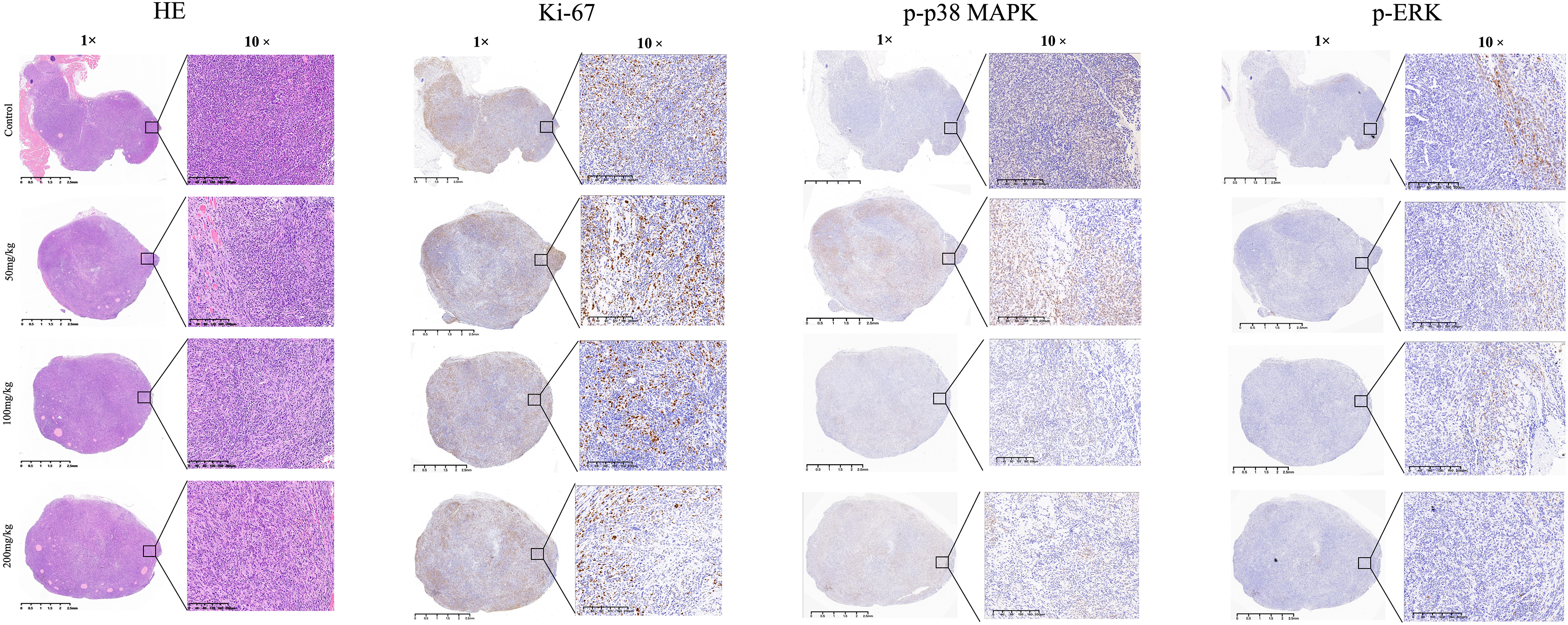 Histological and immunohistochemical analysis of tumor tissues from C57BL/6 mice with subcutaneous Panc02 xenografts treated with HLJDD. Hematoxylin and Eosin (HE) staining illustrates the tumor architecture at 1× and 10× magnification across control (vehicle), 50 mg/kg, 100 mg/kg, and 200 mg/kg HLJDD-treated groups. Ki-67 immunohistochemistry staining, shown at 1× and 10× magnification, indicates cell proliferation, with reduced staining intensity in HLJDD-treated groups, suggesting decreased proliferation. Phosphorylated p38 MAPK (p-p38 MAPK) and phosphorylated ERK (p-ERK) staining at 1× and 10× magnification show decreased staining intensity with increasing HLJDD doses, indicating inhibition of the MAPK and ERK signaling pathways. Scale bars represent 2.5 mm (1×) and 200 μm (10×).