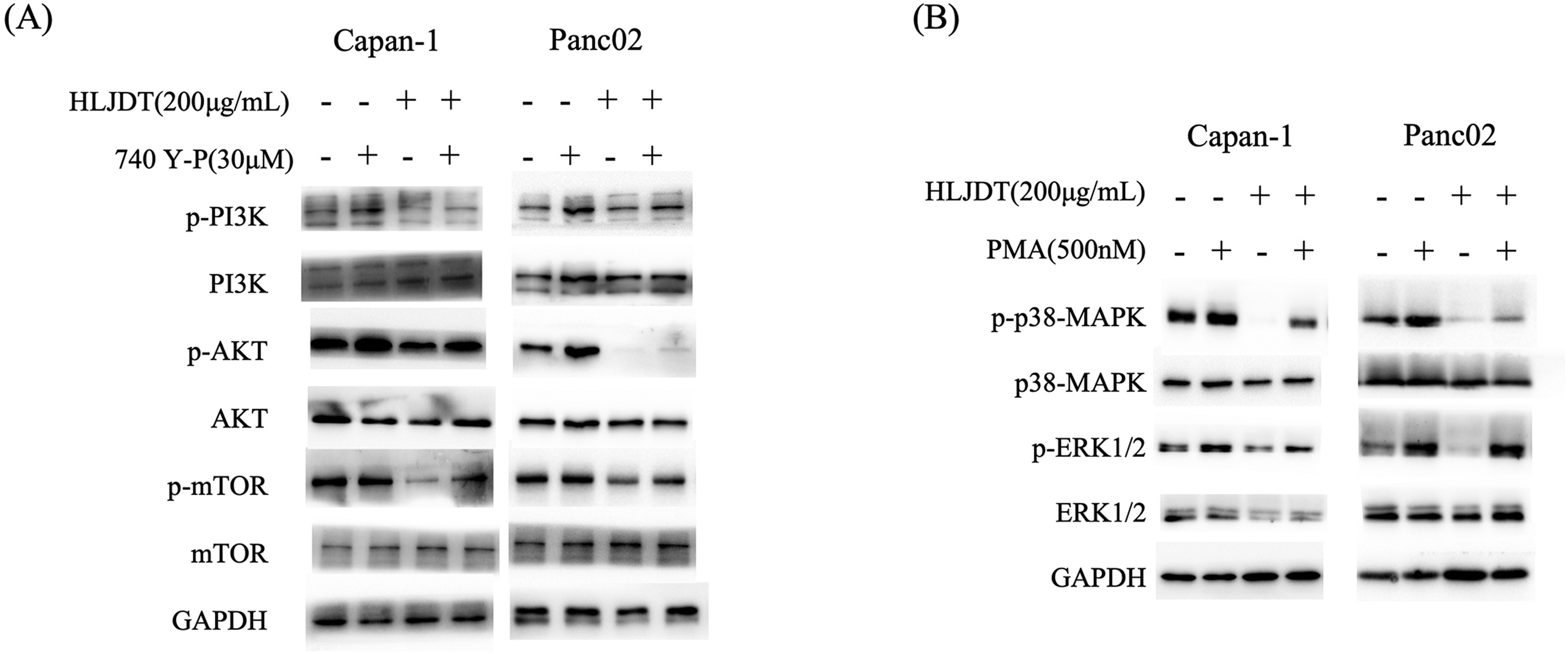 Rescue experiment demonstrating the effects of HLJDD on the PI3K/AKT/mTOR and MAPK signaling pathways in Capan-1 and Panc02 cells. (A) Immunoblot analysis of PI3K, p-PI3K, AKT, p-AKT, mTOR, and p-mTOR in Capan-1 and Panc02 cells treated with HLJDD (200 μg/mL) in the presence or absence of the PI3K activator 740 Y-P (30 μM). HLJDD treatment reduces the levels of phosphorylated PI3K, AKT, and mTOR, indicating inhibition of the PI3K/AKT/mTOR pathway. The addition of 740 Y-P partially reverses this inhibition, restoring phosphorylation levels. (B) Immunoblot analysis of p38 MAPK, p-p38 MAPK, ERK1/2, and p-ERK1/2 in Capan-1 and Panc02 cells treated with HLJDD (200 μg/mL) in the presence or absence of the PKC activator PMA (500 nM). HLJDD treatment reduces the levels of phosphorylated p38 MAPK and ERK1/2, indicating inhibition of the MAPK pathway. The addition of PMA partially reverses this inhibition, restoring phosphorylation levels. GAPDH serves as a loading control in all experiments.