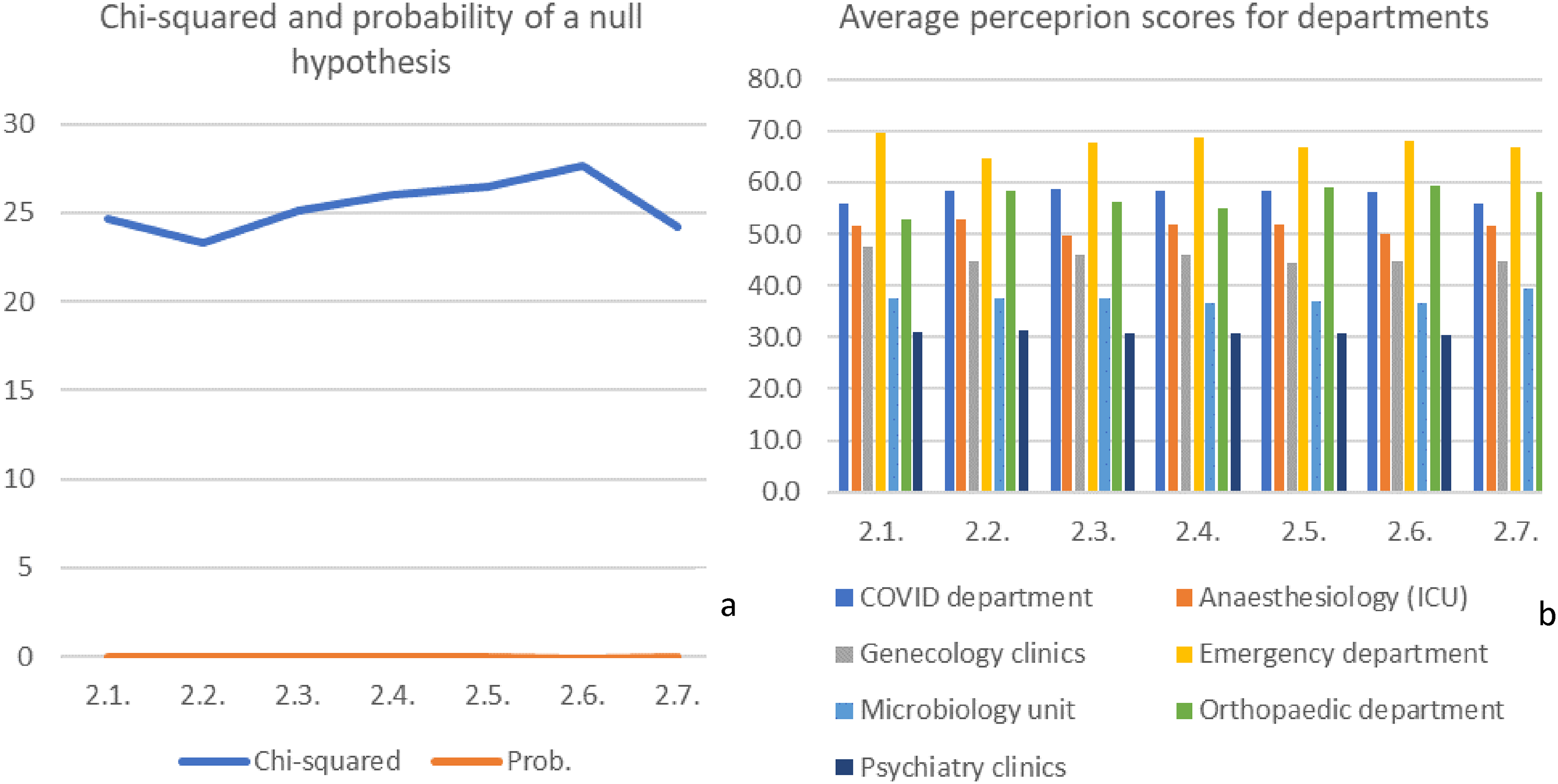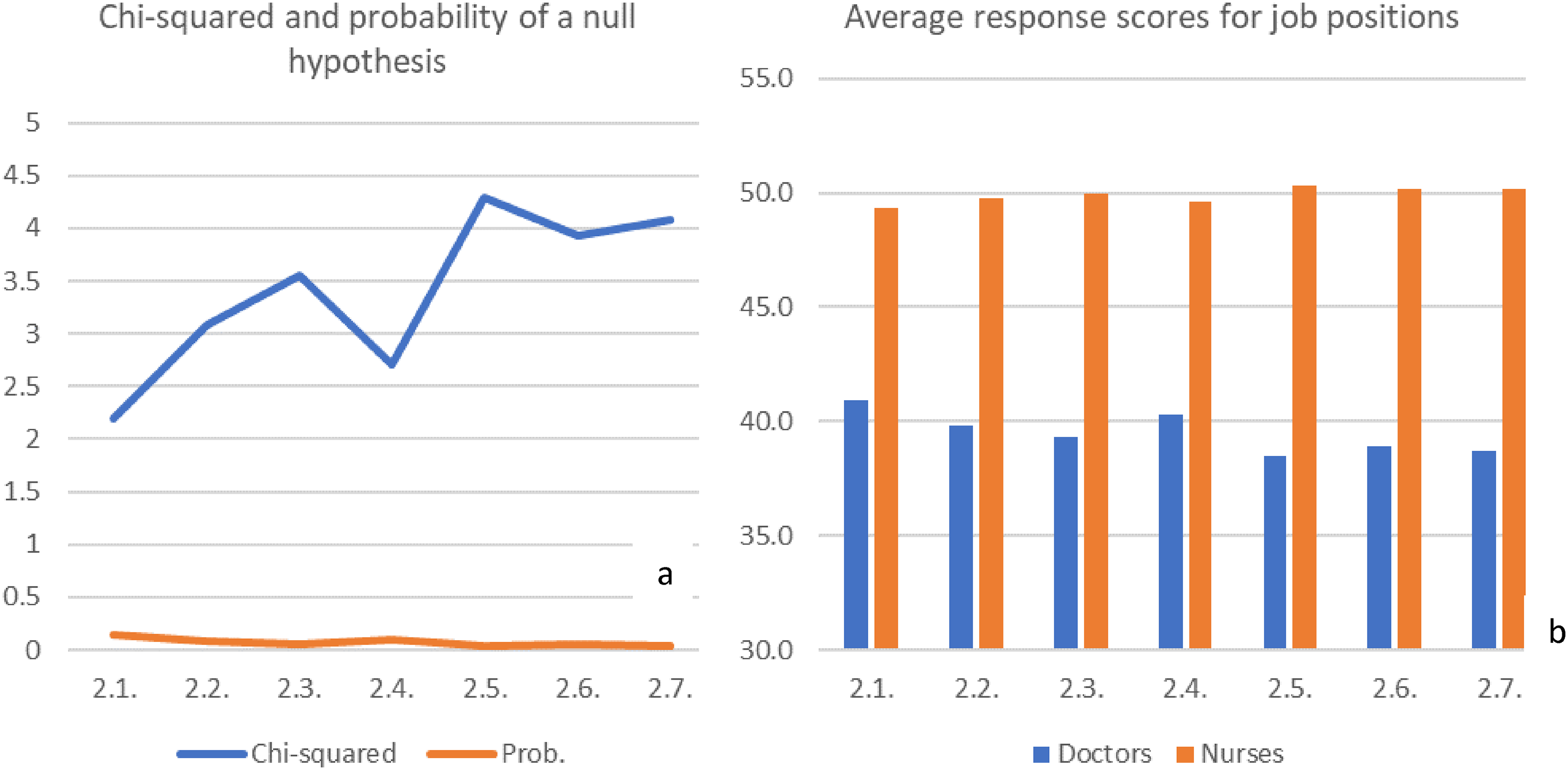 Considering the profession (department) as a group factor, the null hypothesis was disproved for all the response options. As can be seen from Figure 2(a), the probabilities of the null hypothesis for each of the questions were close to zero (within the interval 0.0001–0.0007) with corresponding high Chi-Squared.