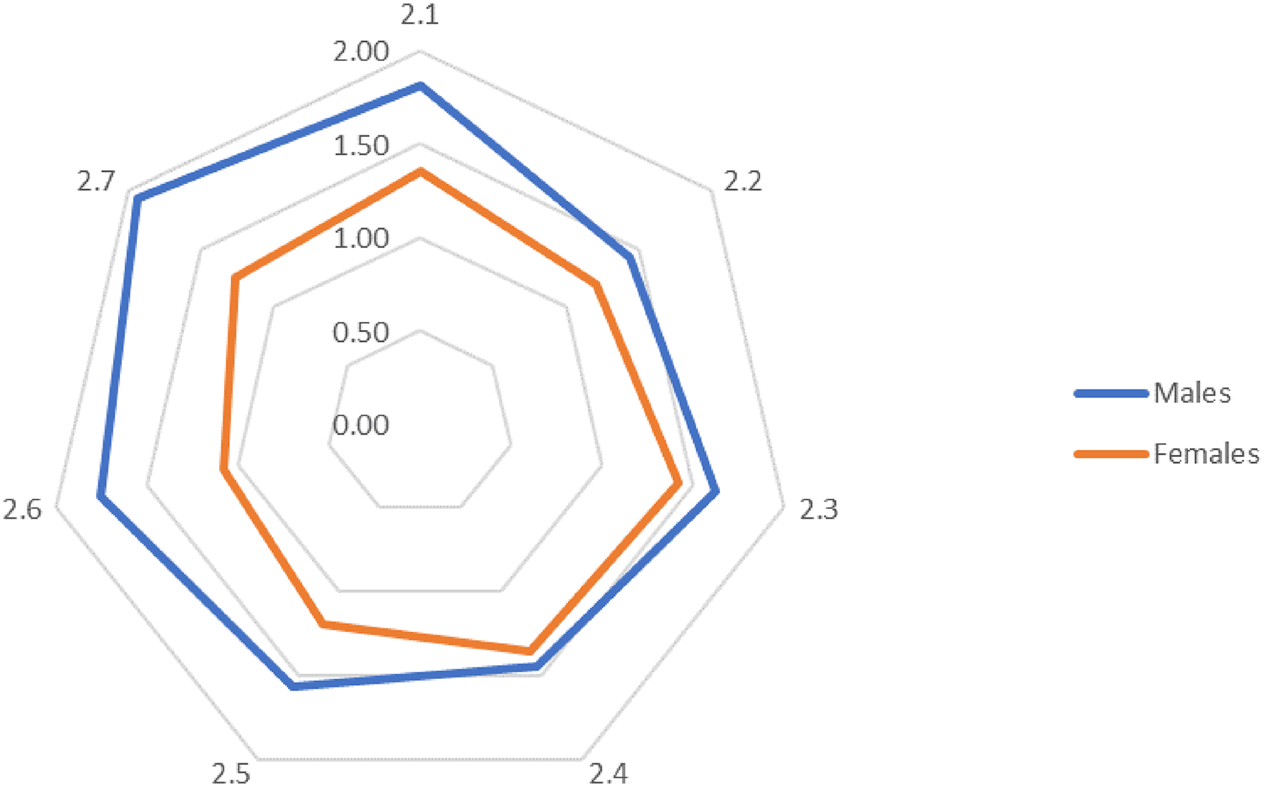 However, despite the presence of certain differences between the perception of adverse events by female and male medical staff, the obtained scores of chi-squared and probabilities indicate the absence of significant differences in their perception of adverse events. The most probable difference, with a probability of a null hypothesis of 0.17, was for question 2.6 that indicates a relatively higher degree of males experiencing a withdrawal from friends and social activities after adverse events compared to their female counterparts.