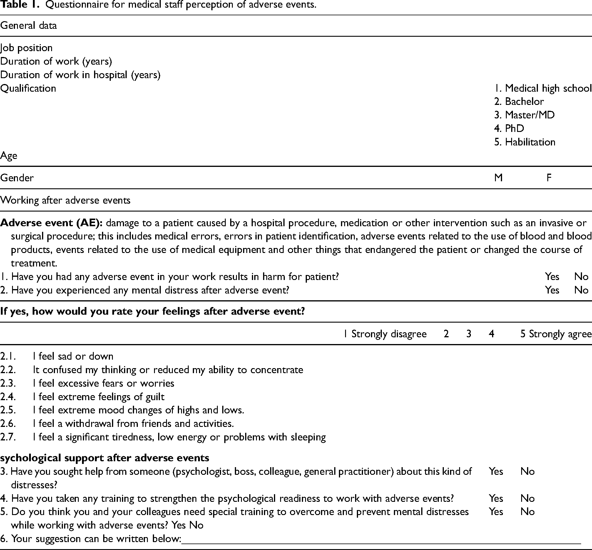 The study of medical staff's perception of involvement in adverse events can be organised using special questionnaires that should consider various kinds of mental distresses of second victims to figure out how deep their distresses are; The sample of the examined potential second victims should be divided into categories, including medical professions, experience, age, and gender, to find out whether this is the same problem for all healthcare professionals; Given the wide range of medical professions experiencing the problem of second victims, an expanded sample of representatives of various departments of the surveyed hospital should be considered, including COVID department, gynaecology department, etc. Given the importance of not only measuring the depth of the problem, but also understanding how to solve it, makes it reasonable to include points in the questionnaire related to previous experience of overcoming the consequences of adverse events examined by medical staff.