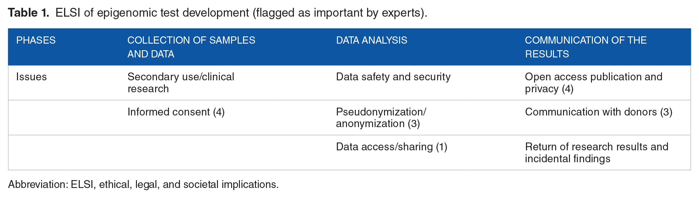 The ELSI identified in this RRI case study are different from most of the ELSI of epigenomics that have thus far been discussed in the academic literature, which includes cautionary analyses of potential future (mis)use of epigenetic data and its impacts on parental and societal (moral) responsibility, legal proceedings, and (bio)political theory. 8 The issues that are confronting test developers today are not new, nor are they specific to epigenomic technology. They include some of the classic issues of research ethics and data protection legislation. Fr the context of epigenetic research and epigenomic test development, however, they require what is called “specification”: “a process of reducing the indeterminateness of general norms to give them increased action-guiding capacity, while retaining the moral commitments in the original norm.” 20 Below, we, therefore, specify existing norms for the 4 priorities established in our expert meeting. The priorities “pseudonymization/anonymization,” “open-access publication,” and “data access and sharing” are discussed together under the heading “privacy and publication of data and research results,” as they are closely related.