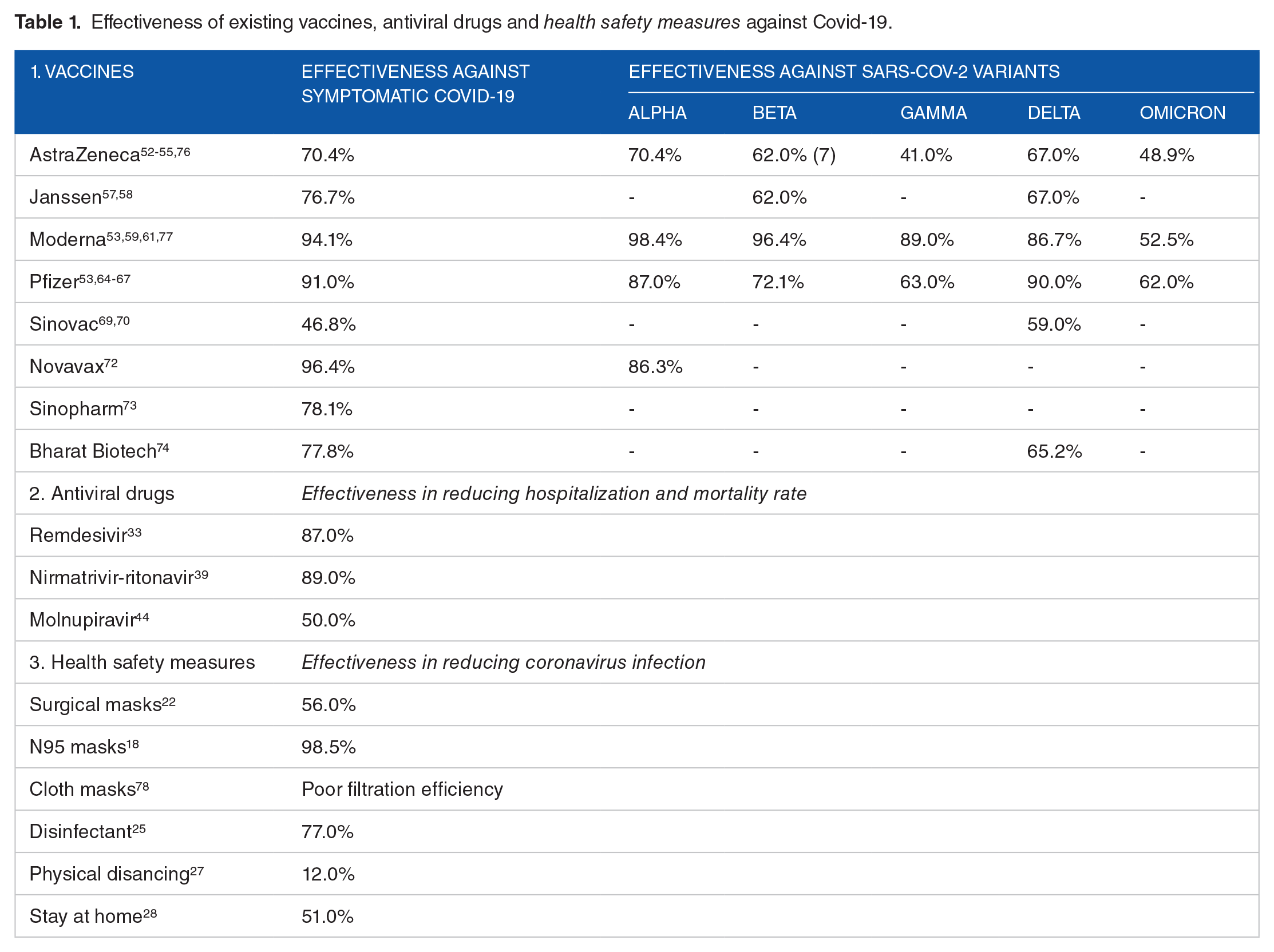 Comparative effectiveness of existing vaccines, antiviral drugs, and health safety measures against Covid-19 have been presented in Table 1. In this study effectiveness means, protection from infection in case of health safety measurements, less hospitalization, and reduced mortality rate in the matter of antiviral agents. This result does not indicate that mask use is useless in fighting Omicron waves. Therefore, mask use remains efficient in reducing the spreading of coronavirus risk as this approach is non-specific to variants. It appears sensible to indicate that more effective respirators for example N95 or equivalent would be preferred to provide significant defense against the Omicron variant (Table 1). Even after vaccination, people should wear masks or keep doing so, particularly in crowded areas. As it is an airborne disease, people should follow social distancing, handwashing, and proper coughing guidelines. We observed that the antiviral drugs are effective in decreasing Covid-19 related hospitalization and mortality rates (Table 1). 75 Also, these oral medications did not increase the incidence of adverse effects. However, oral antiviral agents for Covid-19 are still under investigation. Covid-19 vaccines showed better efficacy against Alpha, Beta, Gamma, and Delta Variants (Table 1). 75 The effectiveness of vaccines has reduced significantly against Omicron variants (Table 1). Astra-Zeneca and Janssen’s vaccines have shown minimum effectiveness against Beta, Gamma, Delta, and Omicron variants. Moreover, all the existing vaccines showed significantly reduced efficacy against the Omicron variant (Table 1). The Omicron variant was not sufficiently prevented by 2 doses of vaccination. Therefore, we require an additional third or booster dose for better performance against the Omicron strain. Also, we noticed inadequate or limited data about the effectiveness of other vaccines against the latest SARS-CoV-2 variants (Table 1). Among these vaccines, AstraZeneca, Janssen, Moderna, and Pfizer have shown better efficacy than others against different variants to prevent the pandemic situation. Vaccination should be widely promoted in several poor and developing nations to achieve the preventative goal. The WHO has repeatedly advised nations to start mass vaccination programs.