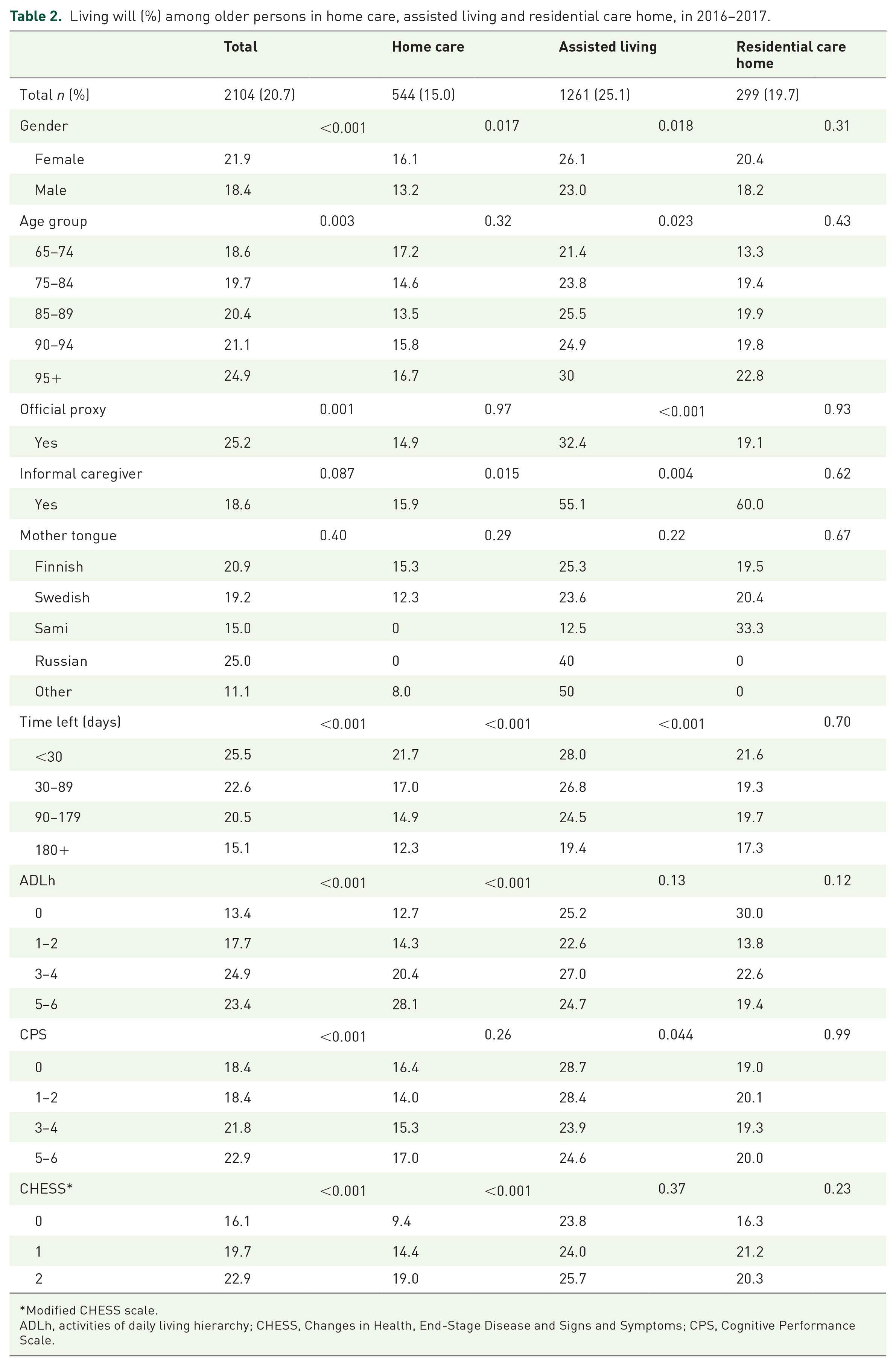 Of the 10,178 participants, 21% had a living will – a greater proportion were female (22%) than male (18%), and a greater proportion of residents in assisted living (25%) and residential care homes (20%) compared with home care residents (15%) had a living will. Female gender (