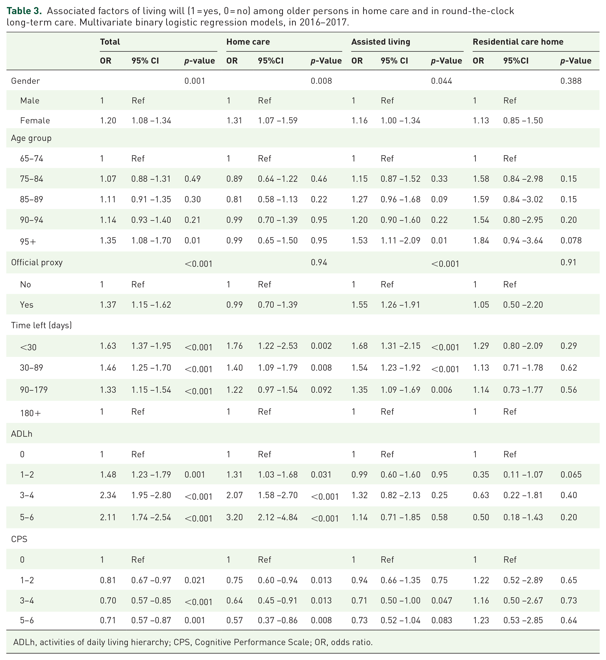 The results of the adjusted multivariate regression model showed that, in home care, all categories of functional capacity in daily activities (ADLh, modified scale) were significantly linked with a living will, whereas in assisted living and in residential care home, no significant associations between physical performance in daily activities and a living will were found (Table 3). Moreover, in a home care setting, all stages of impaired cognition (CPS, modified scale) were found to be significantly linked with a living will. This is in contrast to the fact that in assisted living, only one level – moderately impaired cognition – was found to be significantly associated with a living will (Table 3). Based on the results of this study and proved by earlier studies, losing autonomy seems to be linked to an older person’s activity to complete a written living will.27–29 Overall, older persons receiving home care are less dependent on others in daily living than other long-term care residents; however, when their physical or other functional capacity weakens, they actively start planning for their future care needs. However, based on this study’s findings, we cannot make assumptions about the influence of a service type on whether an individual completes a living will. Instead of just focusing on the differences in service types, future research should aim to investigate older persons with different types of care needs in order to establish how good quality end-of-life care with ACP has evolved.