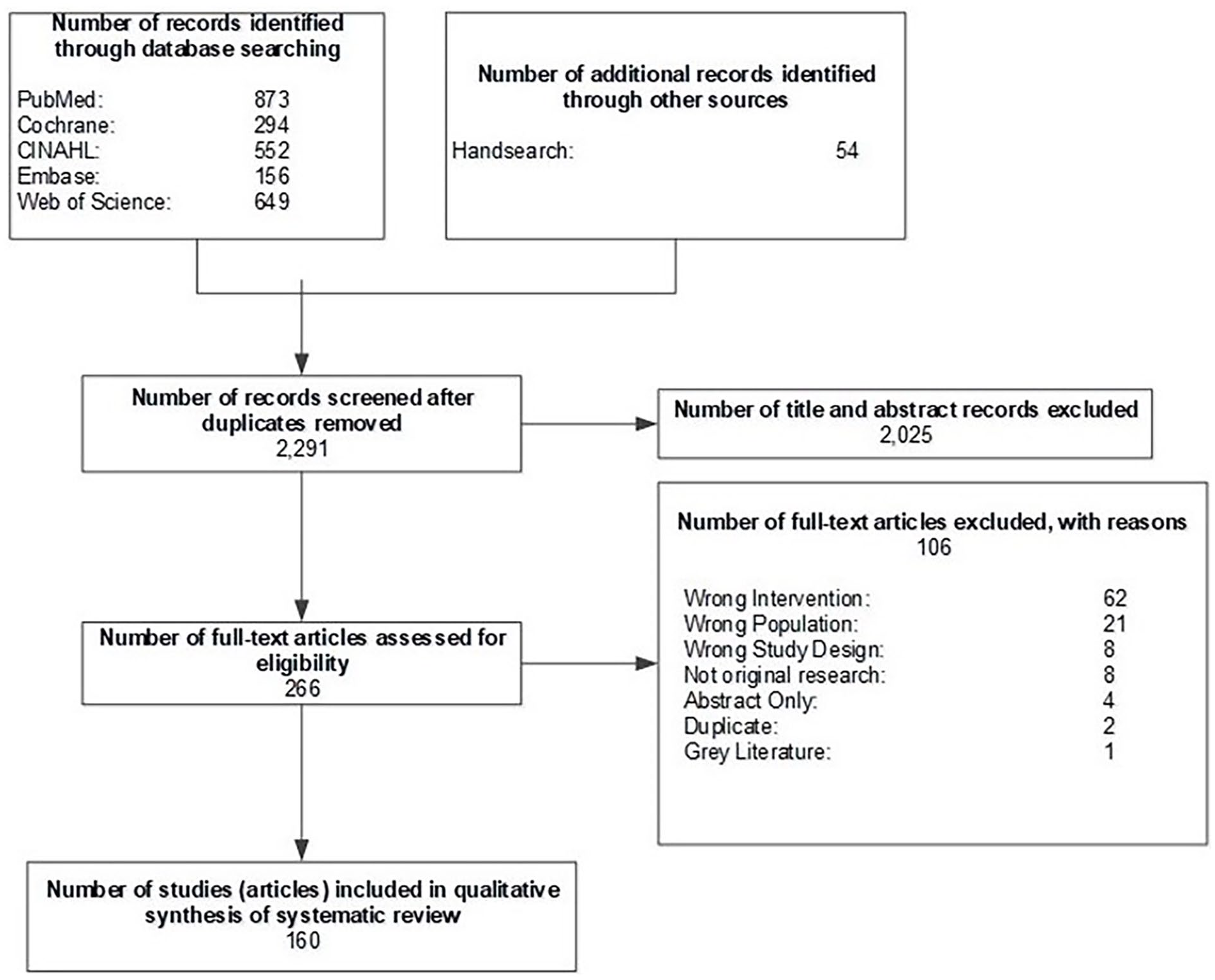 Searches of electronic databases initially identified 2542 articles. After de-duplication and the addition of articles identified by hand search, 2291 articles were screened at the title and abstract stage, of which, 2025 were excluded. Of the 266 articles assessed at the full text stage, 106 were excluded. The most predominant exclusion reason was interventions that did not meet our definition of ACP, where a majority of these were tools designed solely to aid in the completion of advance directives.