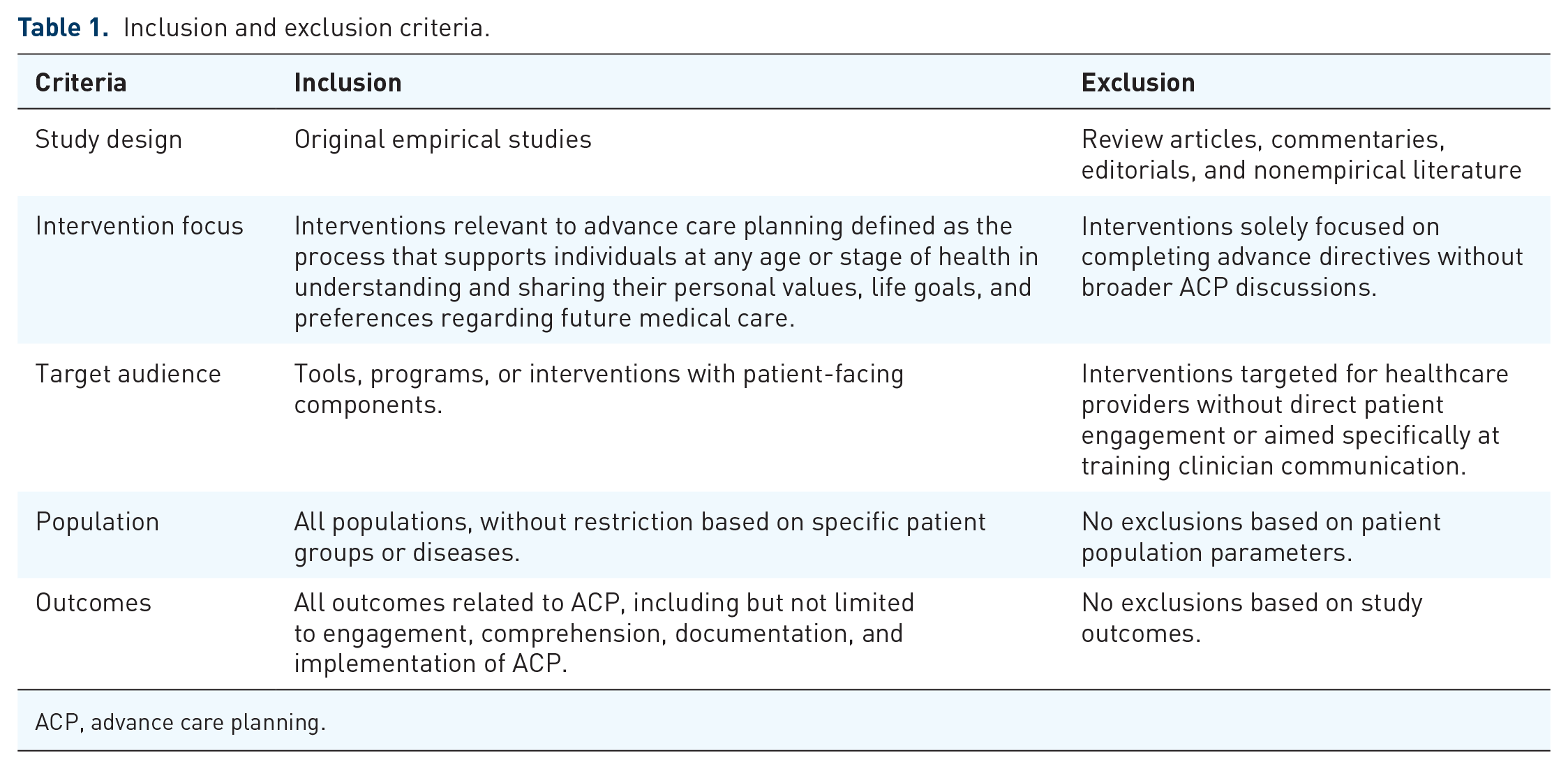 Table 1 details the inclusion and exclusion criteria employed in our review. Studies were excluded if they did not include an intervention relevant to ACP, were not original empirical research, or were targeted for healthcare providers rather than patients. Notably, studies with an intervention aimed only at completing advance directives alone were not deemed comprehensive enough to be classified as an ACP strategy based on our inclusion criteria. While advance directive completion is an integral component of ACP, this delineation aligns with specific standards, such as billing requirements, which identify ACP as a more extensive process of ongoing communication. 12 Further, studies with interventions that were aimed specifically at training clinician communication, rather than for patient-facing interaction, were also excluded.