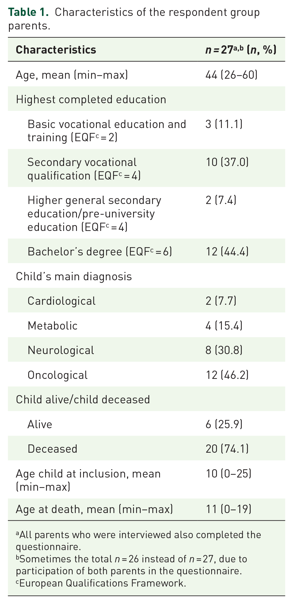 In total, 27 parents participated in the questionnaire, of whom 9 participated in both the interview and questionnaire (Table 1). A total of 161 HCPs participated, of whom 153 in the questionnaire and 24 in the focus group interviews. Of those, 16 HCPs participated in both the questionnaire and focus group interview (Table 2).