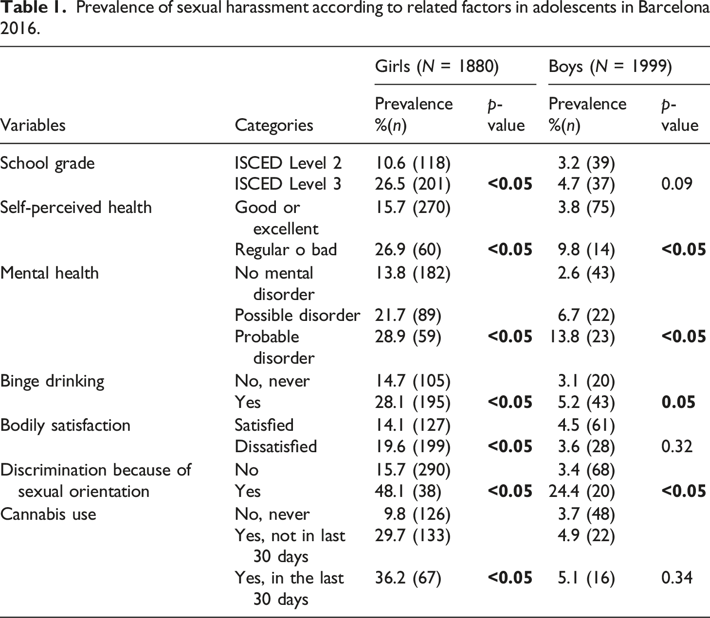 Associations for sexual harassment and related factors in adolescents in Barcelona 2016.