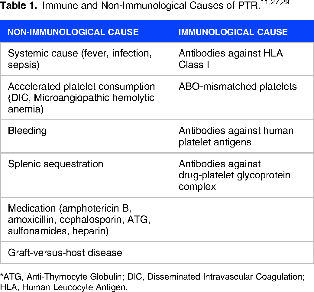 PTR may also arise from cases where the patient has high levels of anti-A or anti-B antibodies, in which there is a possibility of significant removal of donor platelets that carry matching ABO antigens. Thus, transfusing ABO-identical platelets is recommended since such platelets tend to provide a better increment in platelet count compared to ABO-nonidentical units.30,31 Other causes may include CD-36 and drug-related platelet antibodies.32,33 Various drugs such as cephalosporin, penicillin, NSAIDs, L-dopa, and heparin are thought to cause the occurrence of PTR.34,35