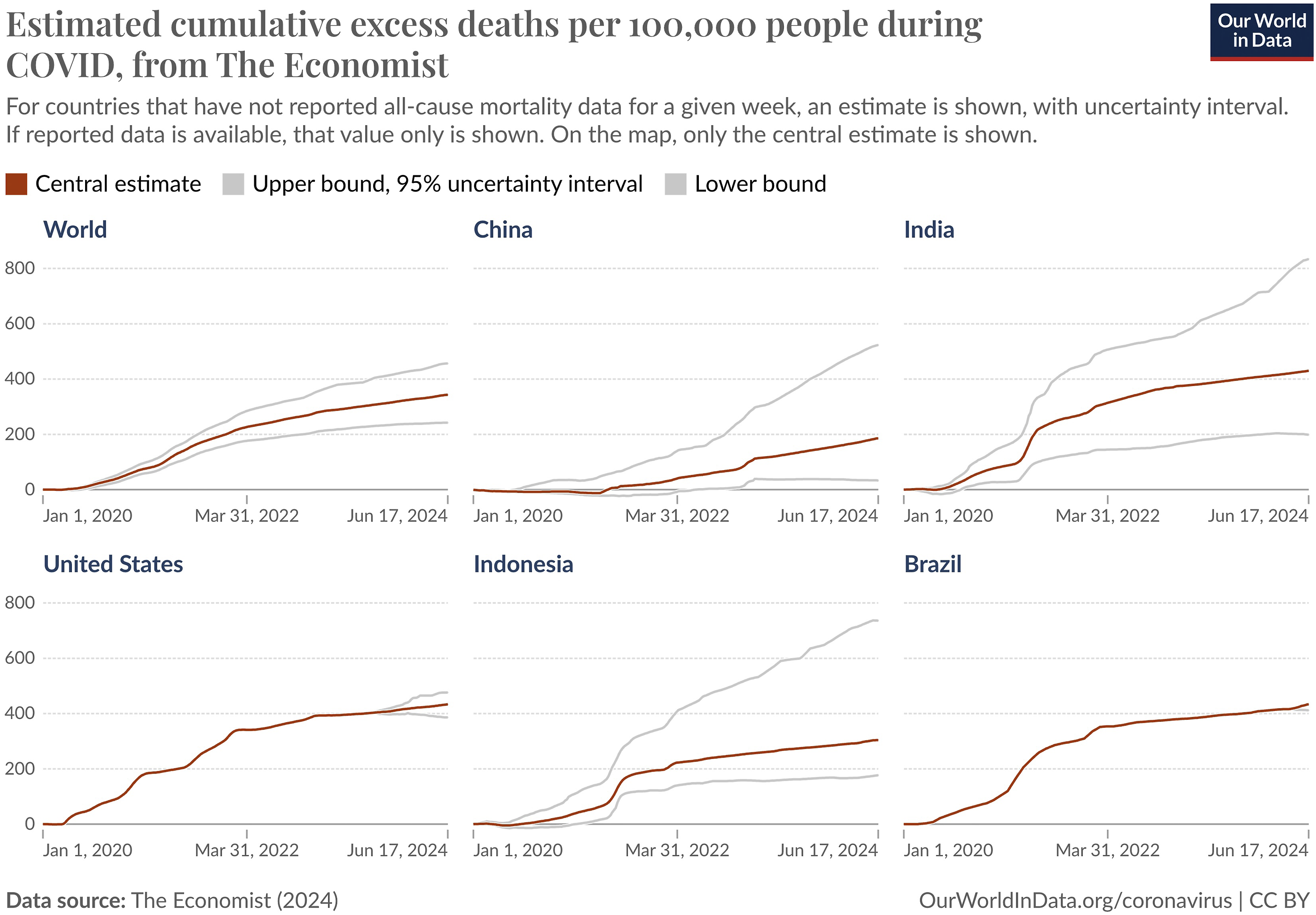 , for instance, we can refer to total death numbers, which were 7.02 million as of April 2024. Alternative ways to communicate this information include COVID-19 deaths per million (97,233.08) or case fatality rate (2%–3%). Figures can also be presented in the form of visual graphs, such as the ones shown in Figure 1: in this case, the precise (quite complex) metric used is described in the top-level heading above the graphs. COVID-19 estimated cumulative excess deaths and visualization from Our World in Data (Right).