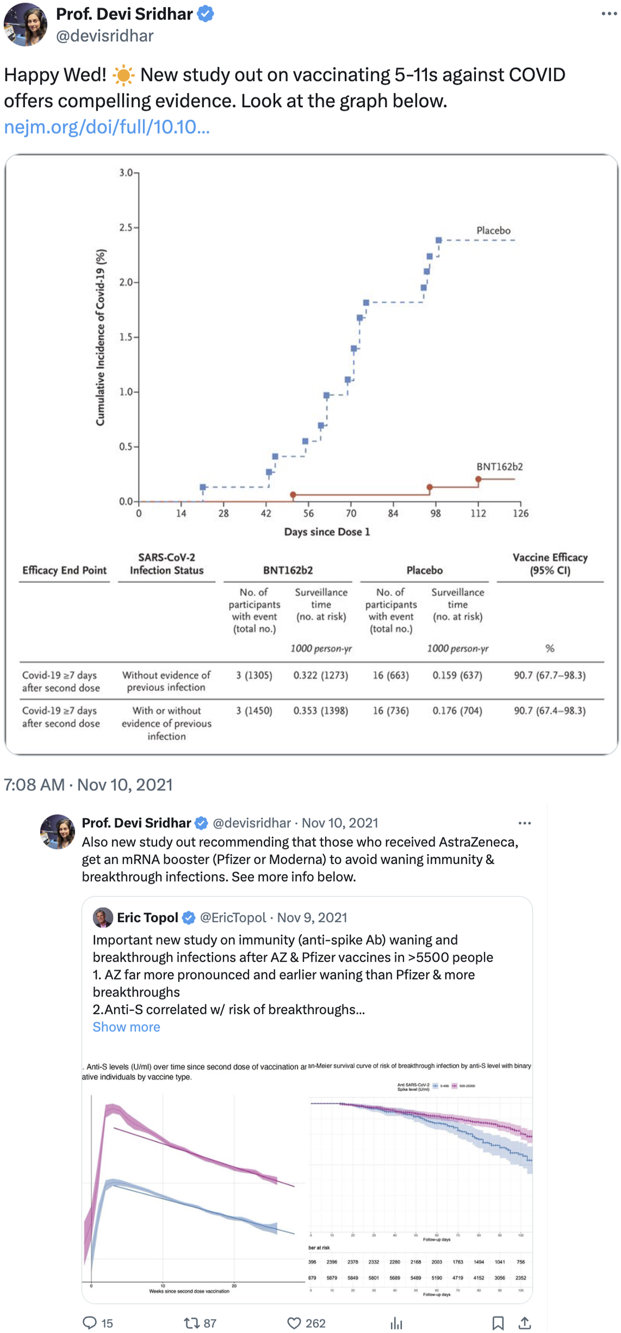 We will begin the discussion in this section with an overview of the types of tweets containing graphs as well as the interactional context in which they occur. This discussion will lay the ground for understanding how argumentative contexts arise in multimodality environments and how graphs function argumentatively. The interaction in which graph tweets occur is relatively simple in terms of sequential organization. The sequence starts with the original post by Sridhar, a verified expert in public health, which usually contains a statement and a graph, as demonstrated in Figure 2 (left). The original graph tweet is sometimes followed up with a second graph tweet (Figure 2, right), which shows as Sridhar’s reply to her original tweet. The follow-up tweet in this example consists of a graph post by another Twitter user and Sridhar’s rephrasing of the post, expanding on the original tweet as further evidence. An example of a graph tweet: original posts (retrievable at https://x.com/devisridhar/status/1458330831076962308).
