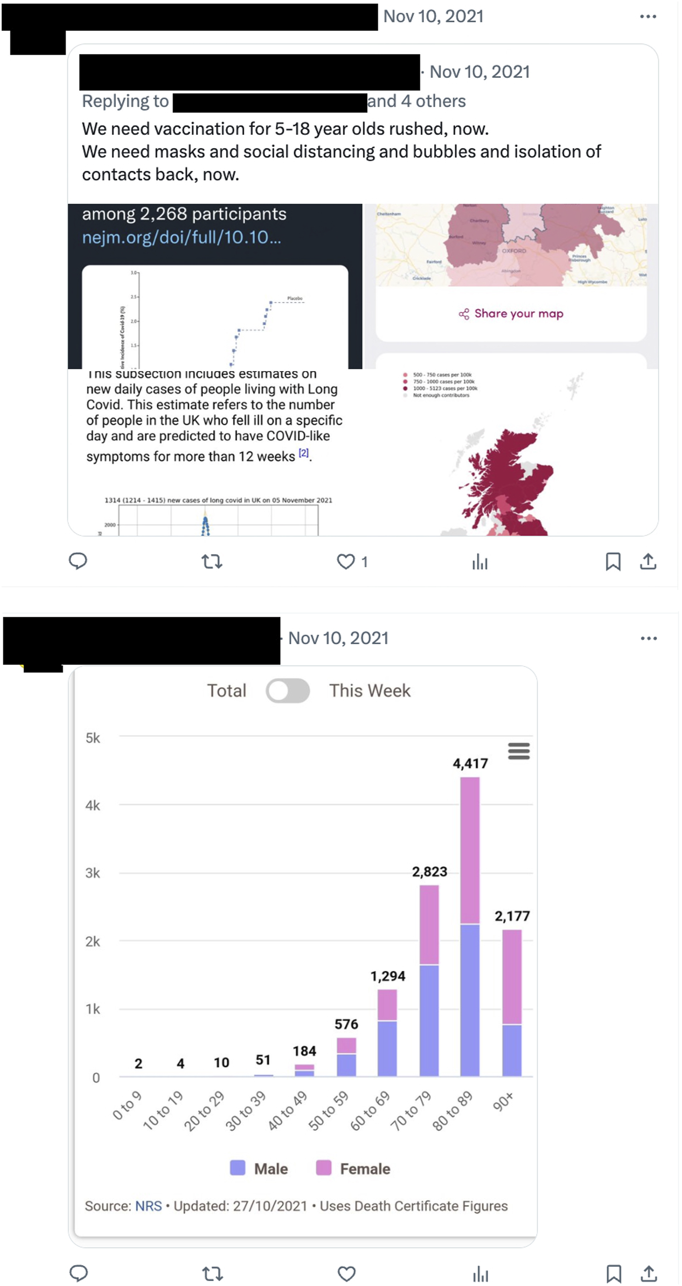 We collected all tweets she posted on her accounts between March 15, 2020, when her first column on COVID-19 appeared in The Guardian, and April 18, 2022, when the final COVID-related legal requirement (mask-wearing in public transport) was removed in Scotland. The period of data collection mirrors closely the timeline of COVID-19 in the UK, especially in Scotland 4 , where Sridhar played a significant role in shaping public policy. We devised a multi-stage, mixed-method data collection approach informed by our ethnographic observation of the Twitter interactions described in the previous paragraph. While qualitative researchers increasingly rely on software such as MAXQDA for mining social media data (see, for instance, Noakes et al., 2023), we opted for a combination of scraping and manual methods to better manage the rhizomatic nature of Twitter interactions, where a single post can generate multiple layers and strands of replies. We first built the dataset using the online service Apify 5 , which allowed us to automatically scrape all the tweets during the specified period. We manually cleaned up the dataset, removing tweets that are not related to the discussion of the pandemic. In the COVID-19 tweets, we identified 10 in which Sridhar used numerical graphs in her initial post, two of which included two graphs. To ensure we identified all instances of numerical graphs in the data, we used metadata provided by the scraper that indicates the presence of images in tweets. Additionally, we manually reviewed the Media tab on Sridhar’s account, which displays all image files she posted. We then collected all replies to her tweets, isolating those that contained numerical graphs, resulting in a dataset of 20 graph tweets and 34 graphs. Finally, we manually collected descriptors of the users who posted these tweets, as well as the second-tier interaction sequences (i.e., replies to the tweets) in which graph tweets were embedded.